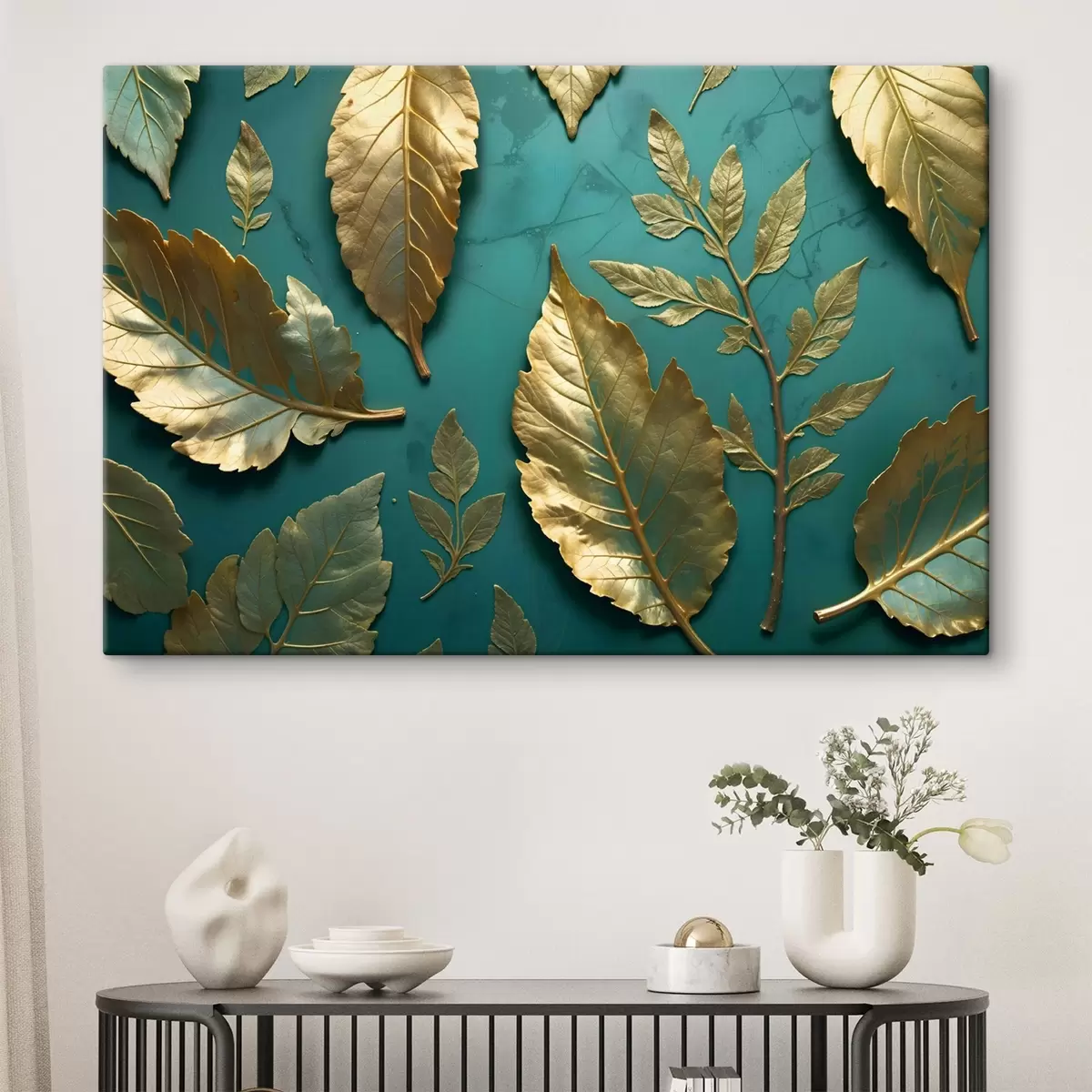 Schilderijen Gele delicate bladeren op een groenblauwe achtergrond, voor een elegante botanische print s41727