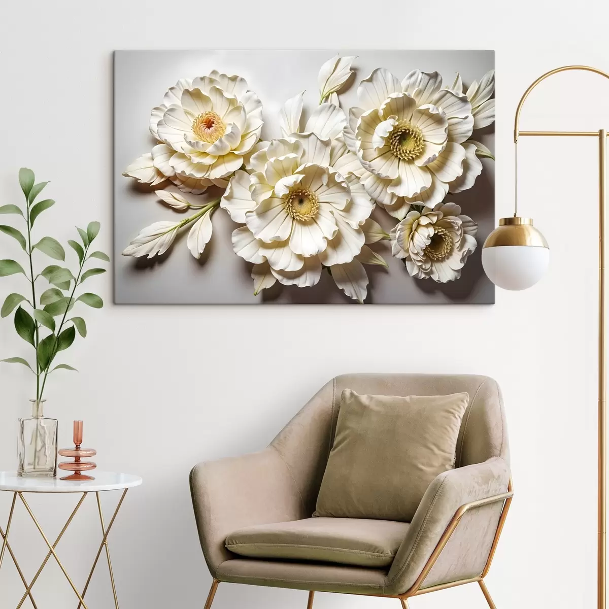 Schilderijen Elegante witte en gele bloemen met ingewikkelde details tegen een effen achtergrond s41731