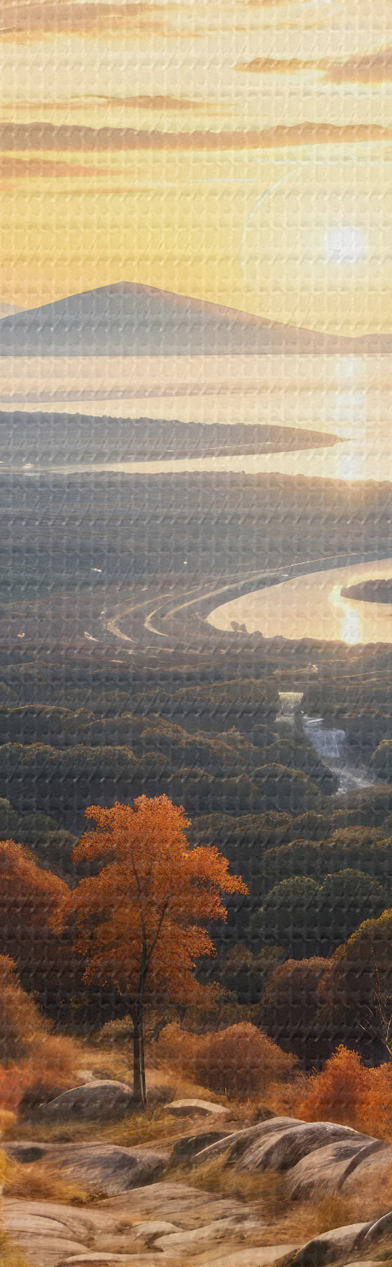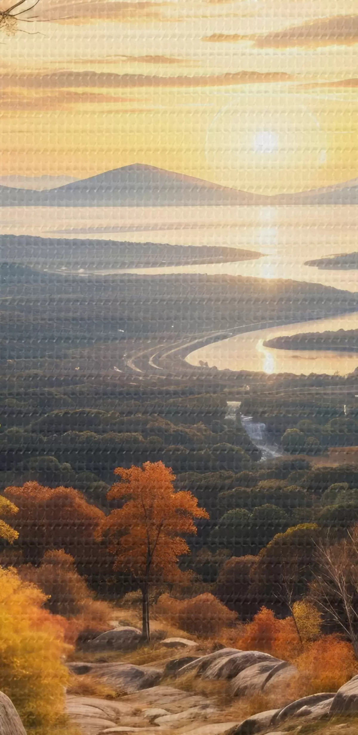 Schilderij Landschap met een kronkelend zandpad dat leidt door een bos van herfstkleurige bomen en een zonsondergang Art. s41732