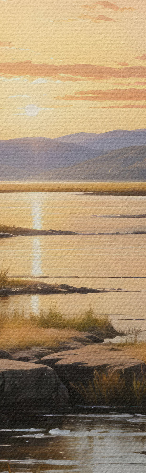 Schilderij Een sereen landschap met een meer omringd door pijnbomen, die de warme kleuren van de zonsondergang weerspiegelen Art. s41733