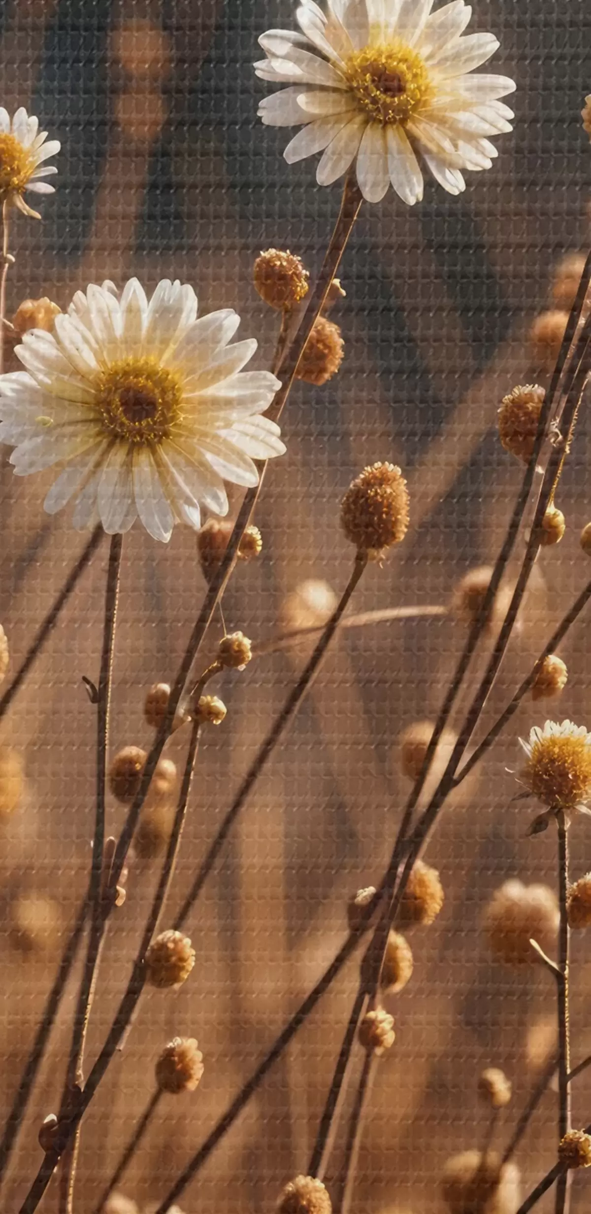Schilderij Witte margrieten in een veld van gedroogd gras en stengels, met warm avondzonlicht Art. s41735