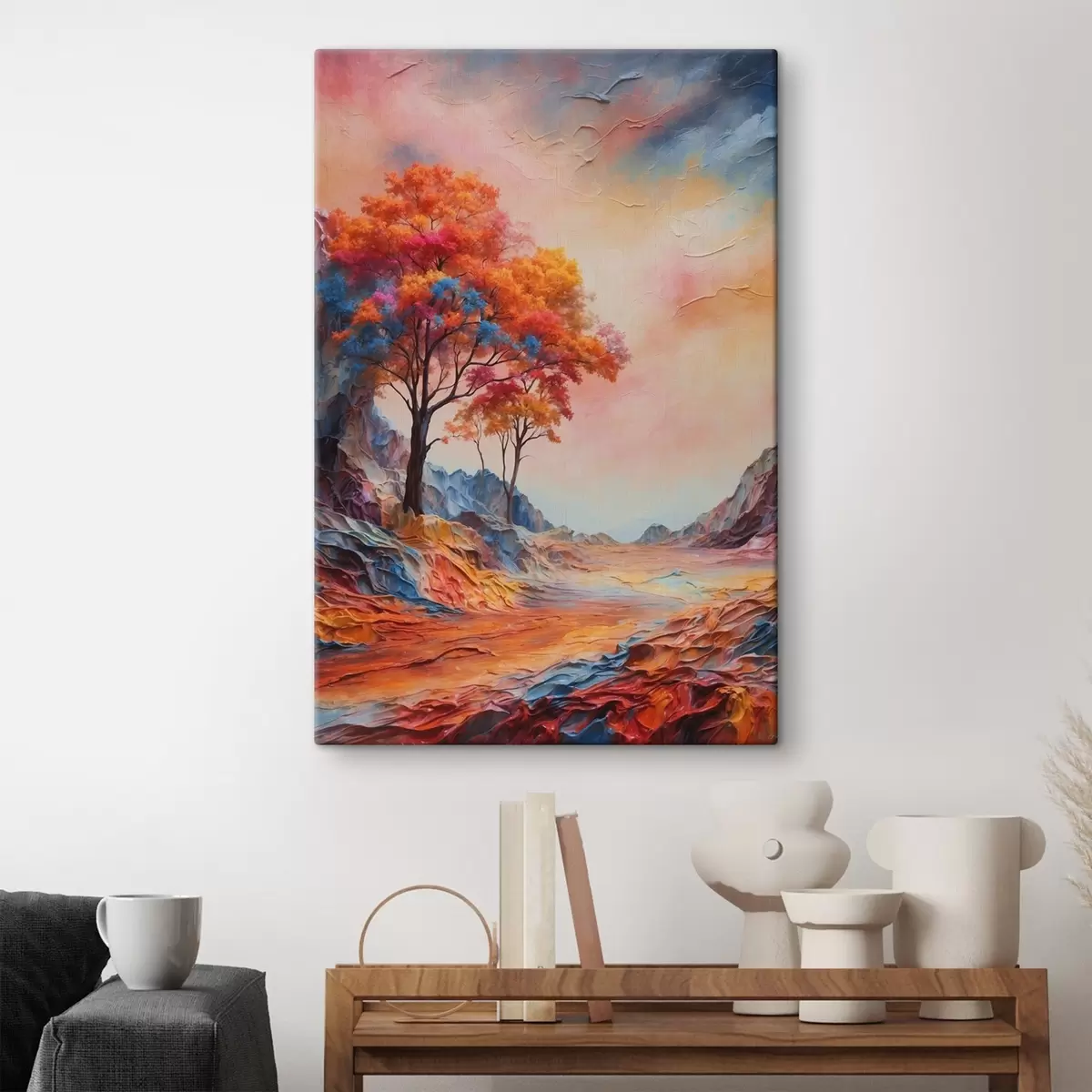 Schilderij Bomen en abstracte veelkleurige bergen Art. s41772
