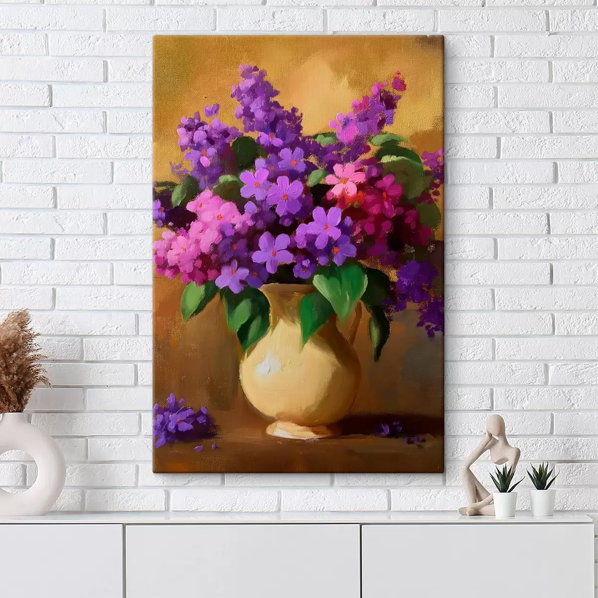 Schilderij Paars-roze bloemen in een gele kan Art. s41822