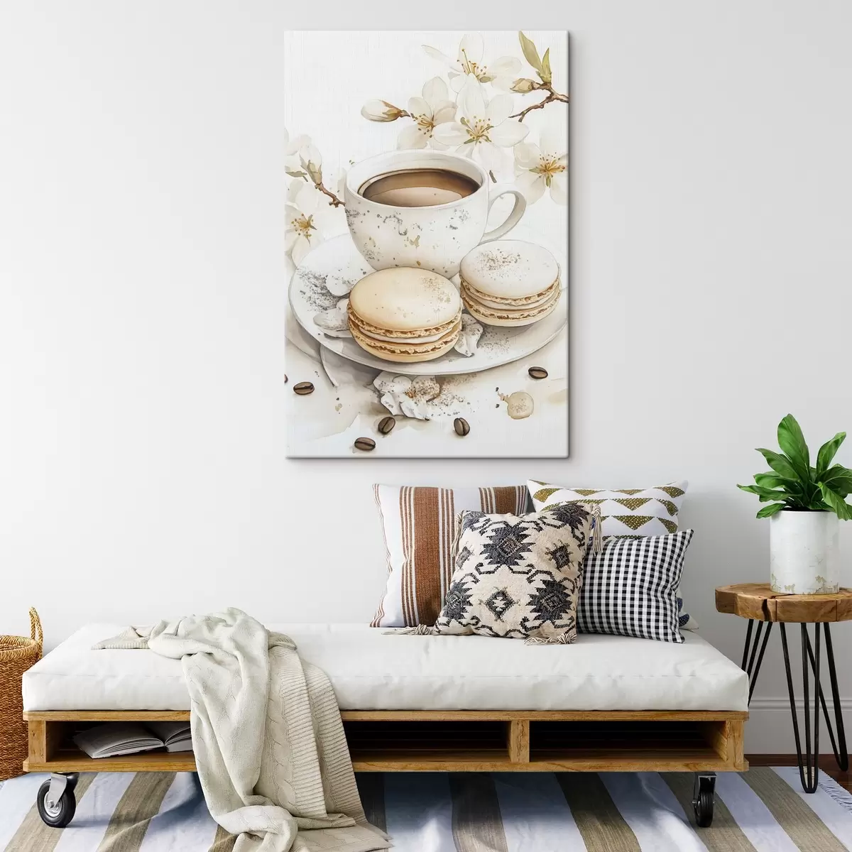 Schilderij Kopje koffie met bitterkoekjes, aquarelstijl, zachte kleuren, jasmijnbloemen Art. s41949