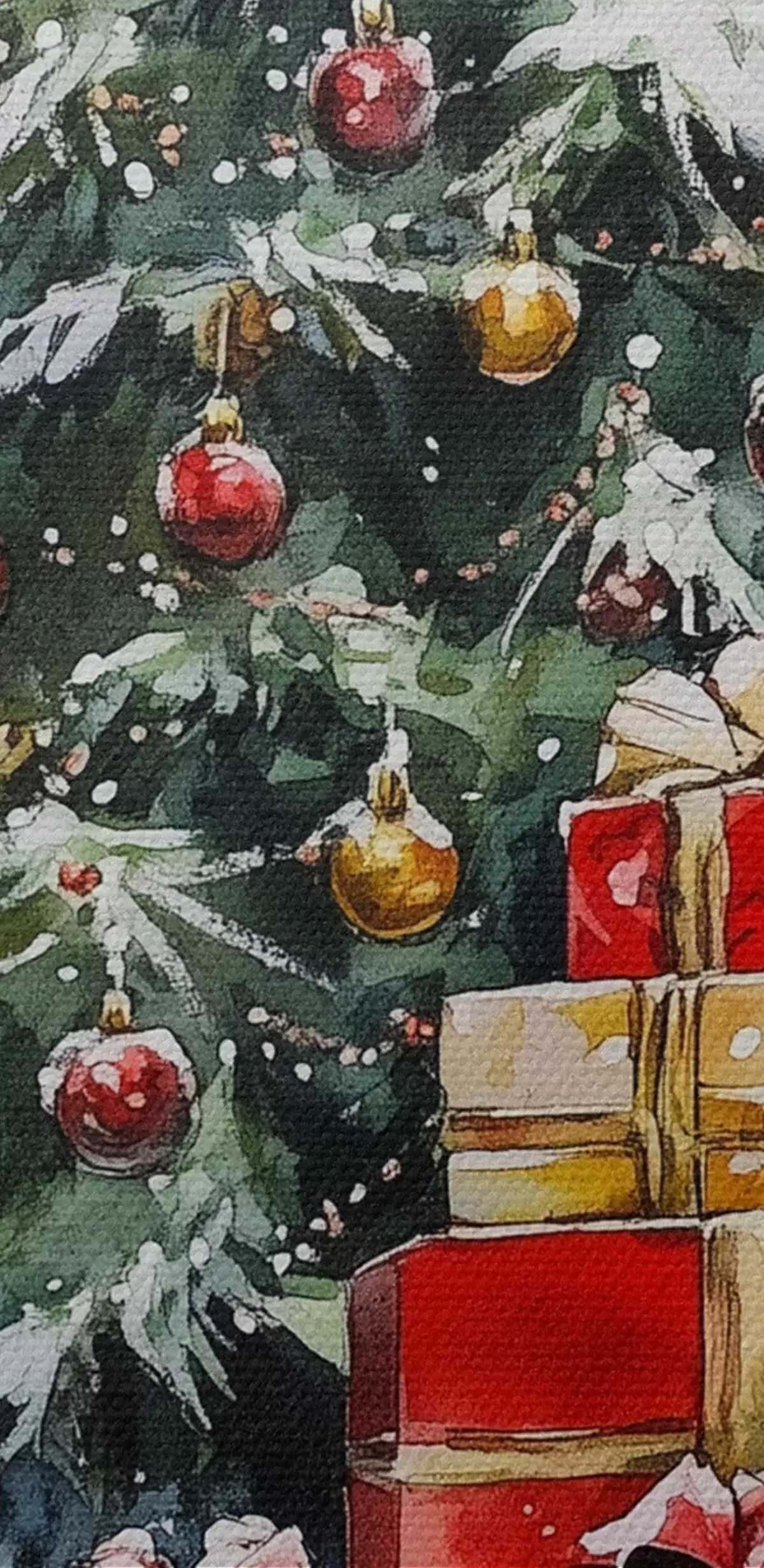 Schilderij Feestelijke kerstboom met ingepakte cadeautjes, sneeuw, aquarel stijl Art. s41953