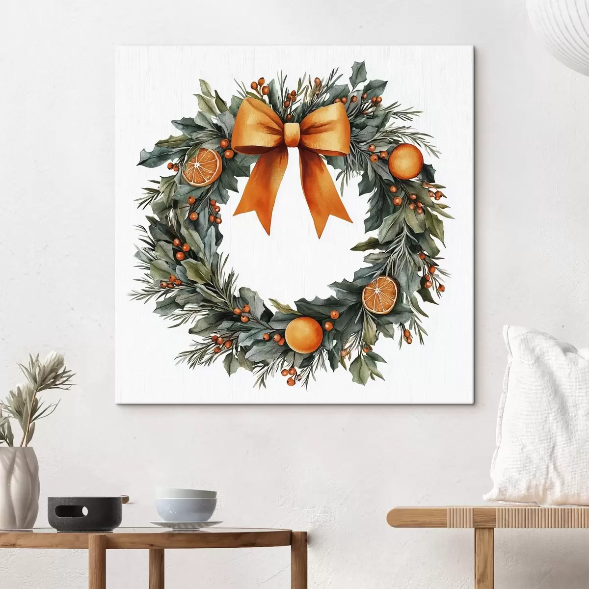Schilderij Prachtige feestelijke krans met dennen, sinaasappels, bessen en strik Art. s41955