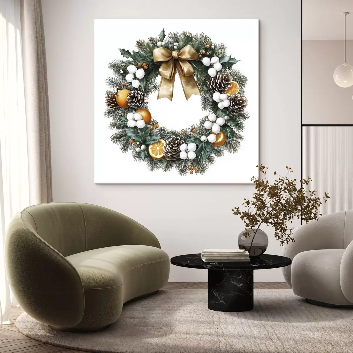 Schilderij Kerstboomkrans met strik, katoen, sinaasappels, bessen en dennenappels Art. s41962