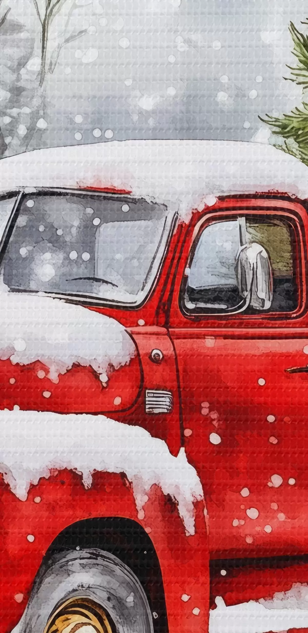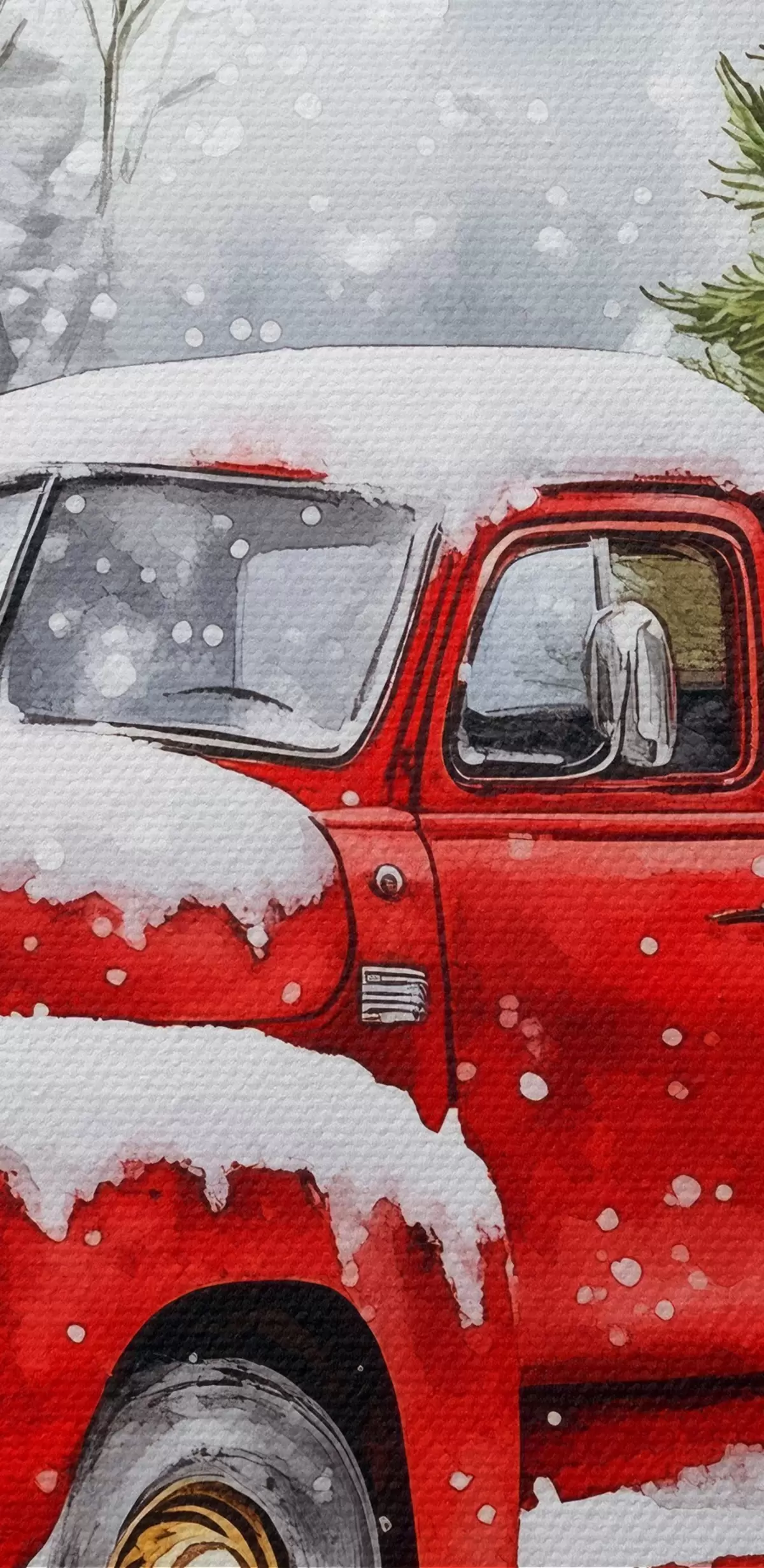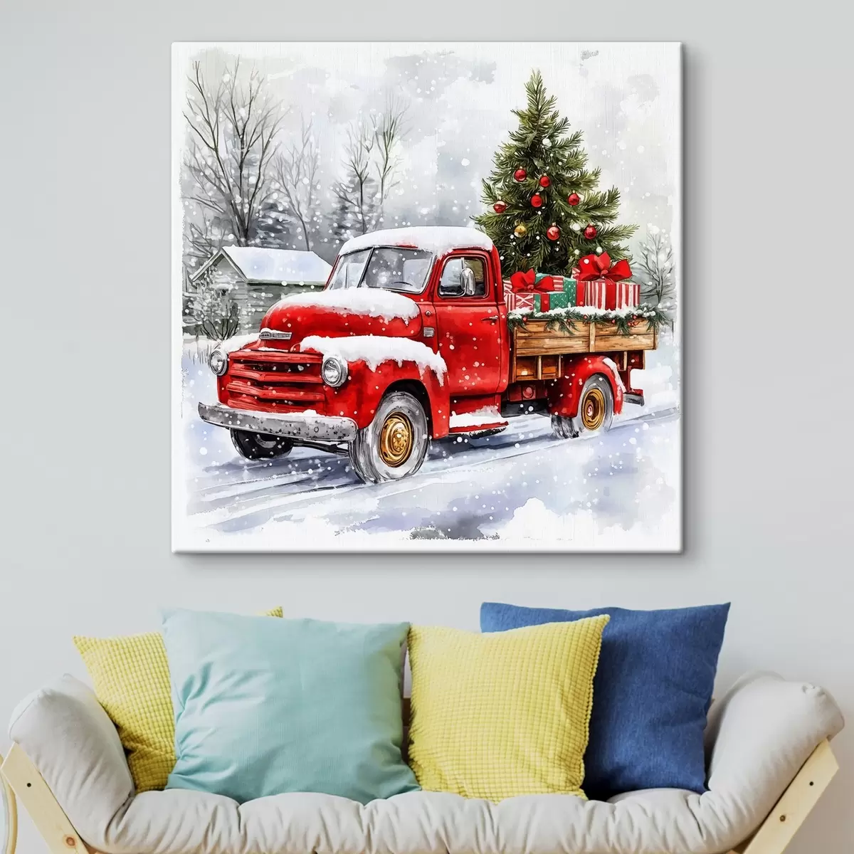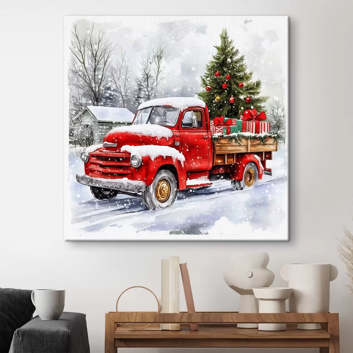 Schilderij Een kerstauto met een boom en cadeaus in besneeuwd weer Art. s41968