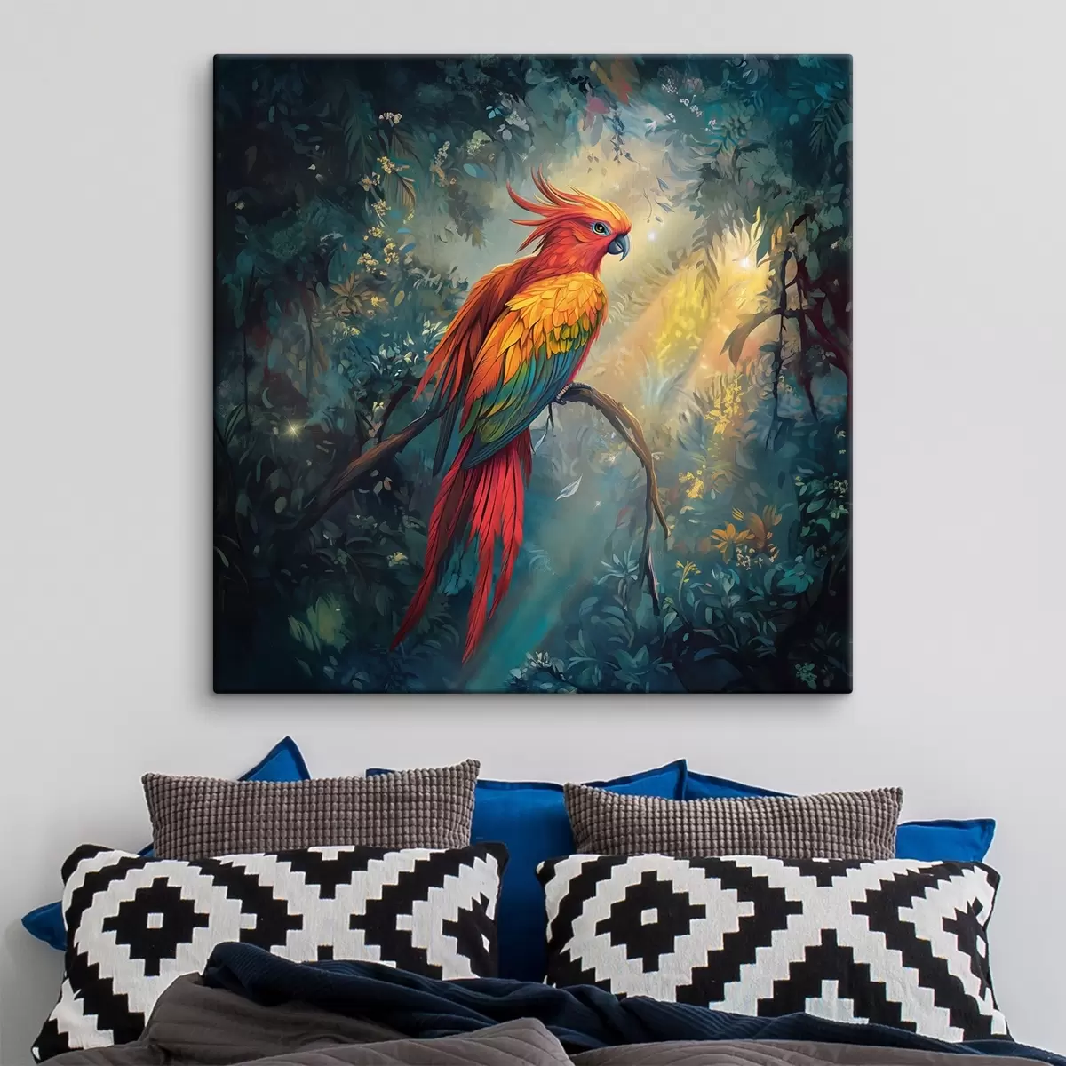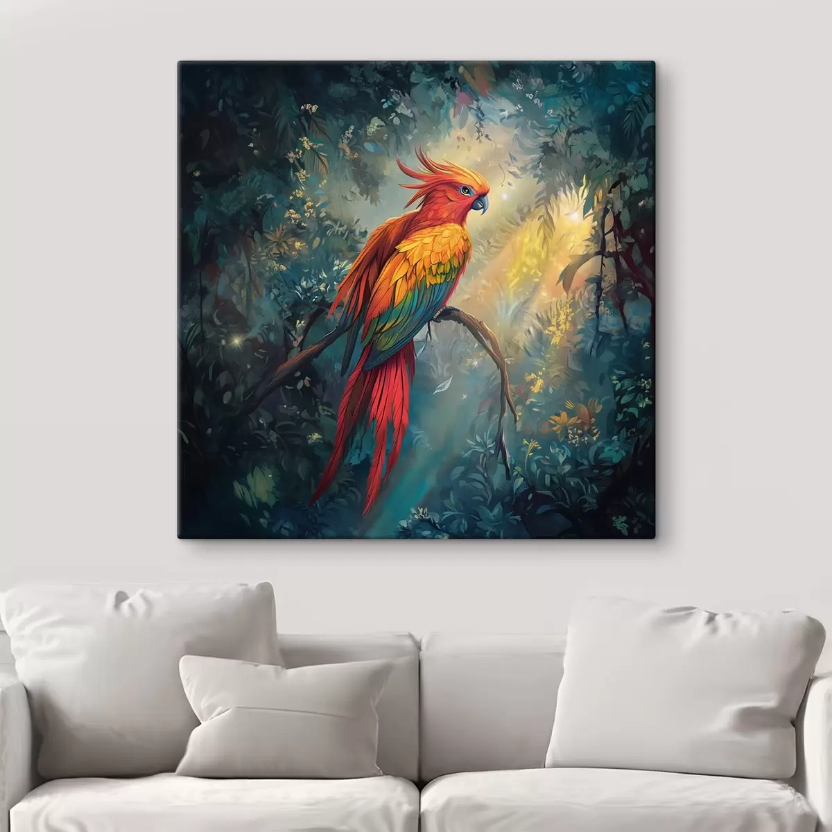 Schilderij Een kleurrijke papegaai in de jungle met doordringende lichtstralen Art. s41970