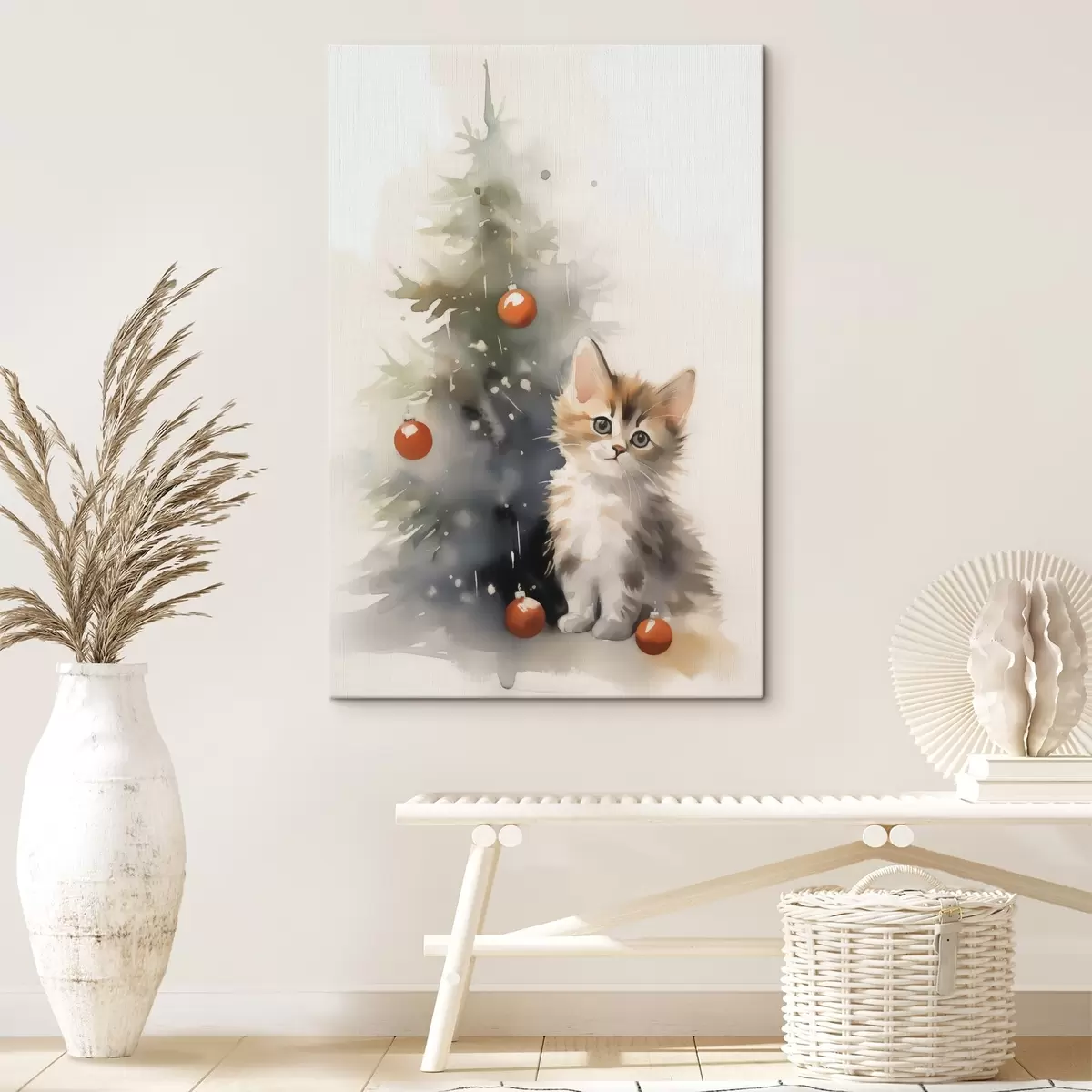 Schilderijen Katje bij de kerstboom imitatie van natte aquarel s42140