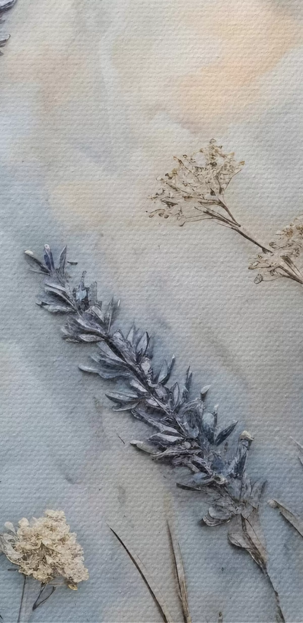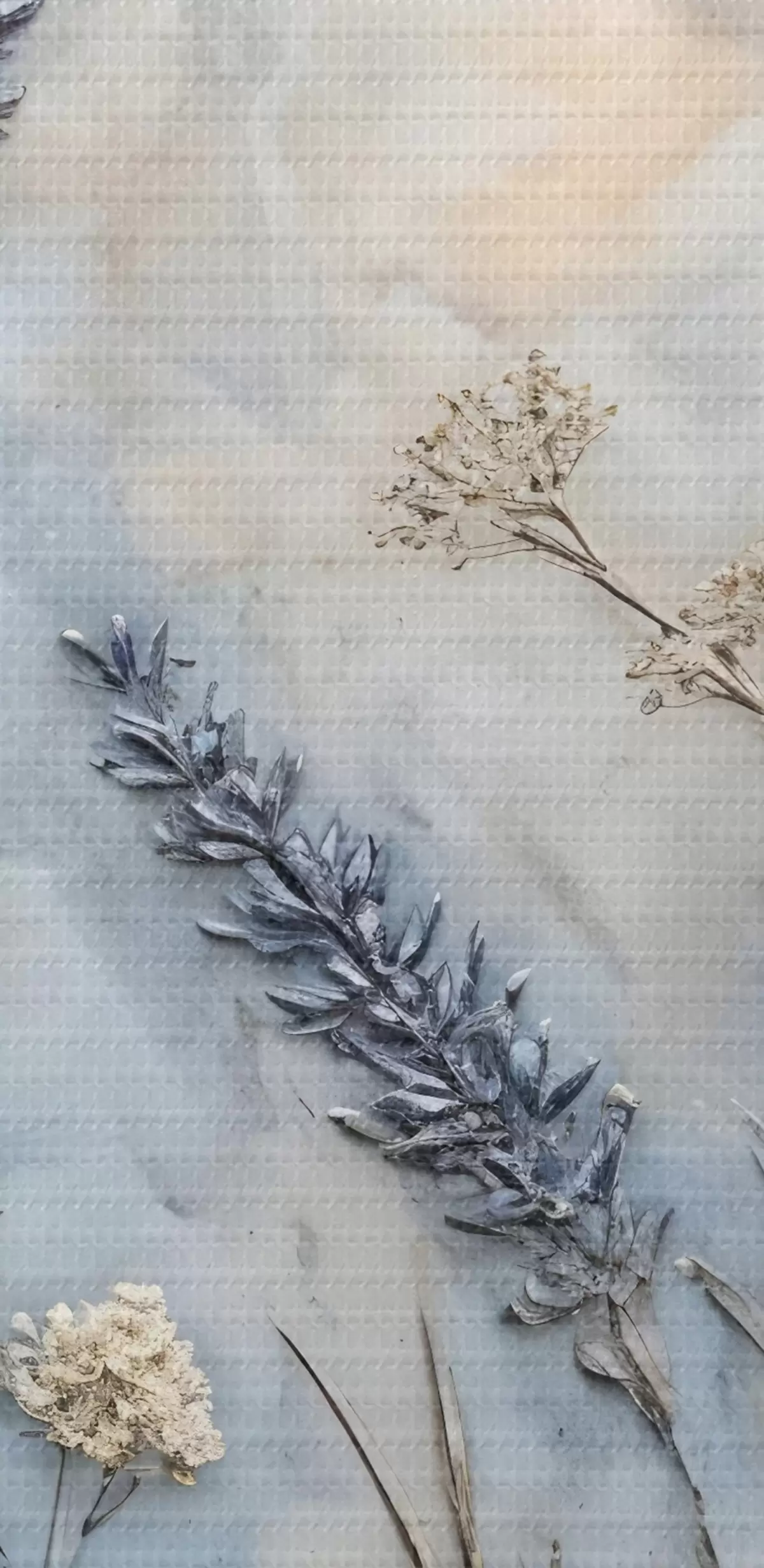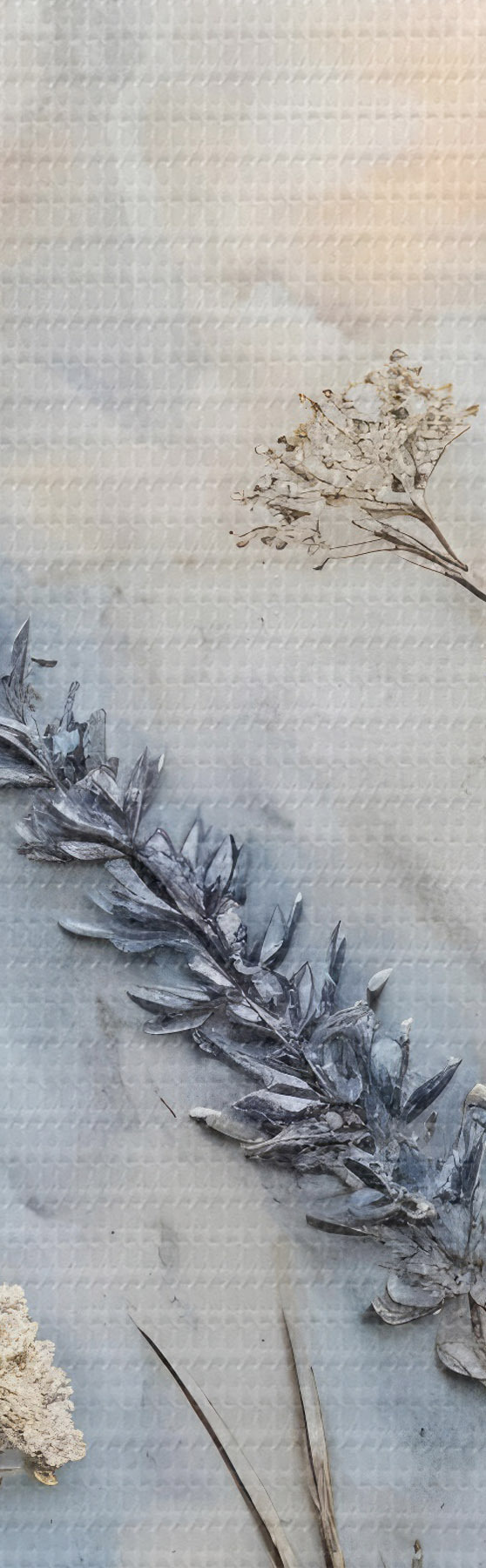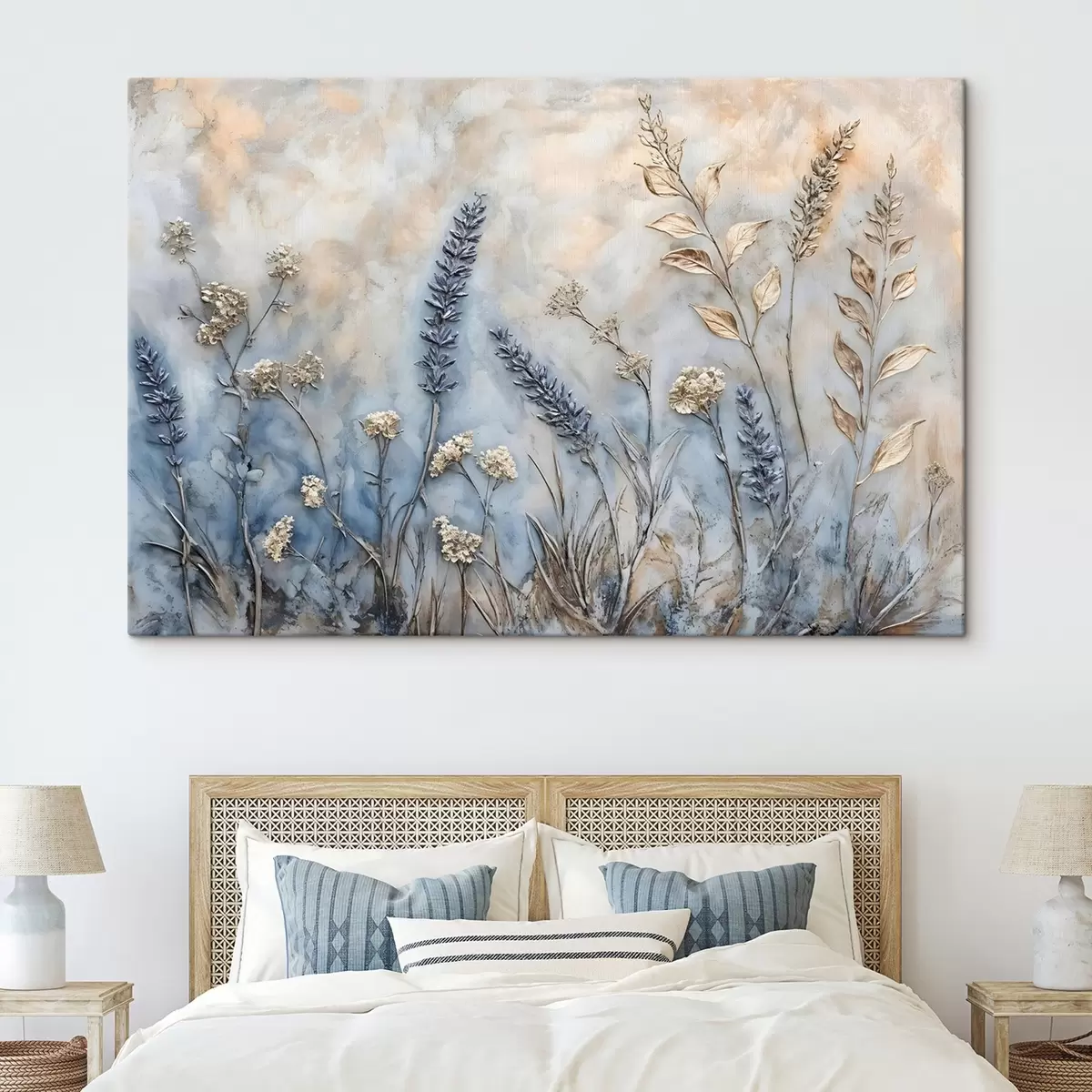 Schilderij Een veld met verschillende wilde bloemen en planten in blauw-, wit- en beigetinten tegen een zachte, wazige achtergrond Art. s42214