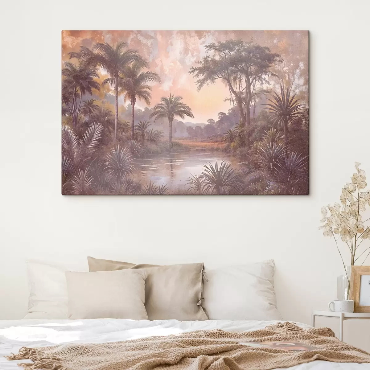 Schilderij Een tropisch landschap met een sereen meer omringd door weelderige palmbomen en ander gebladerte Art. s42219