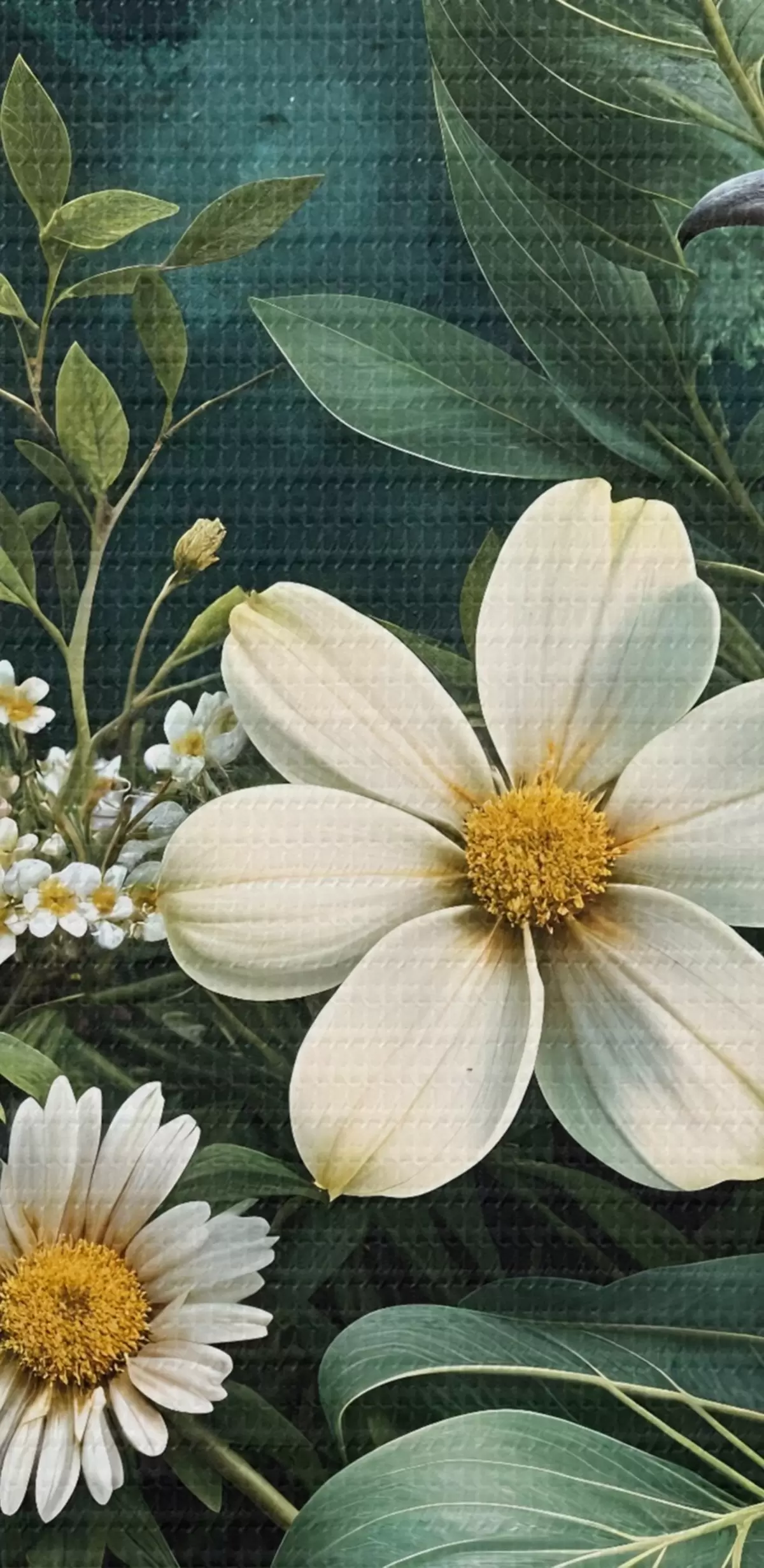 Schilderij Kleine vogels zitten op takken omringd door weelderig tropisch gebladerte, inclusief grote groene bladeren en kleurrijke bloemen Art. s42220