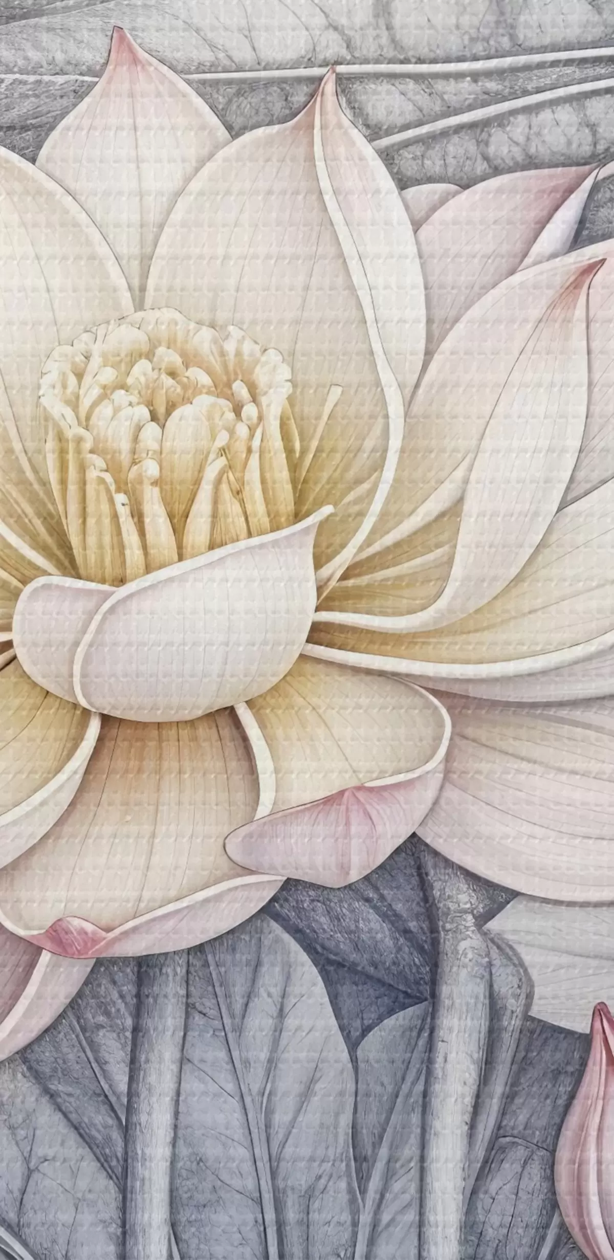 Schilderijen Grote roze en witte lotusbloemen met groene bladeren en stelen op een lichte achtergrond met gedetailleerde bloemblaadjes en hartjes s42221