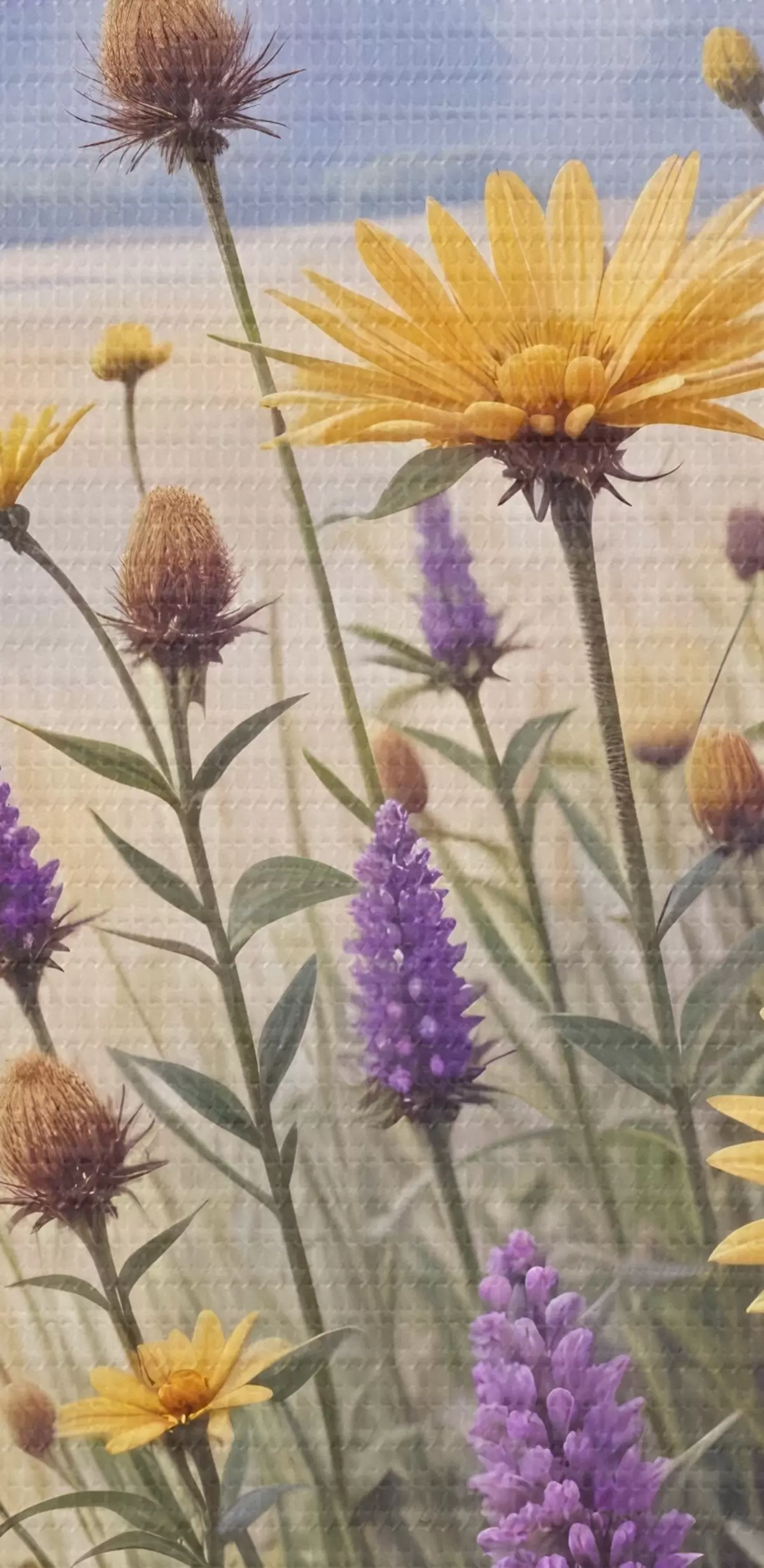 Schilderij Een veld met gele zonnebloemen en paarse wilde bloemen in een mistig boslandschap met pijnbomen op de achtergrond Art. s42223