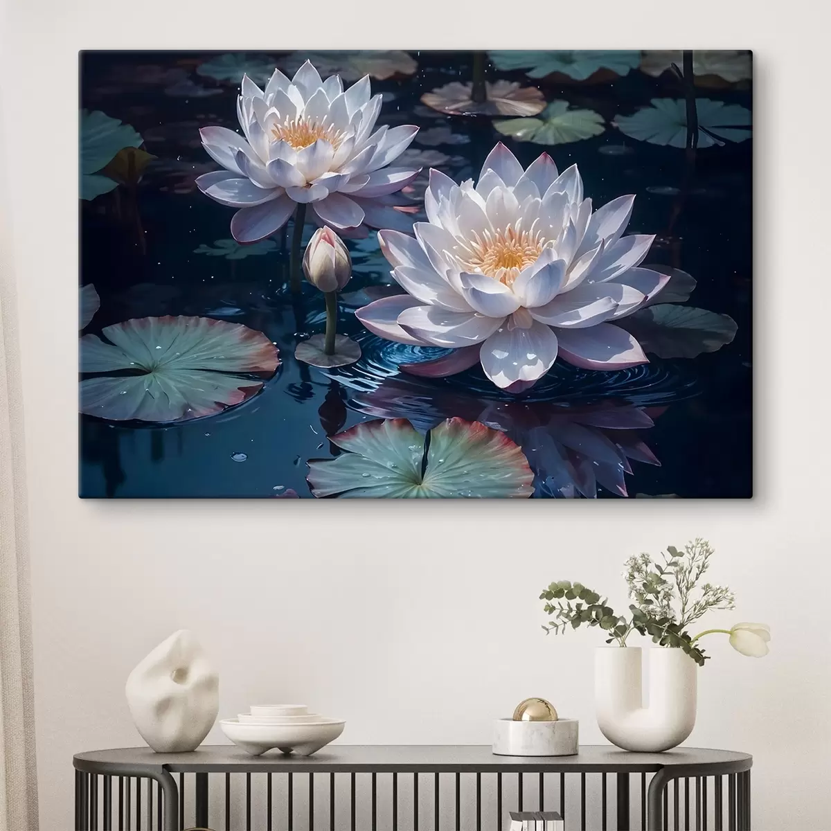 Schilderij Witte lotusbloemen drijvend op een kalme vijver met lelieblad Art. s42225