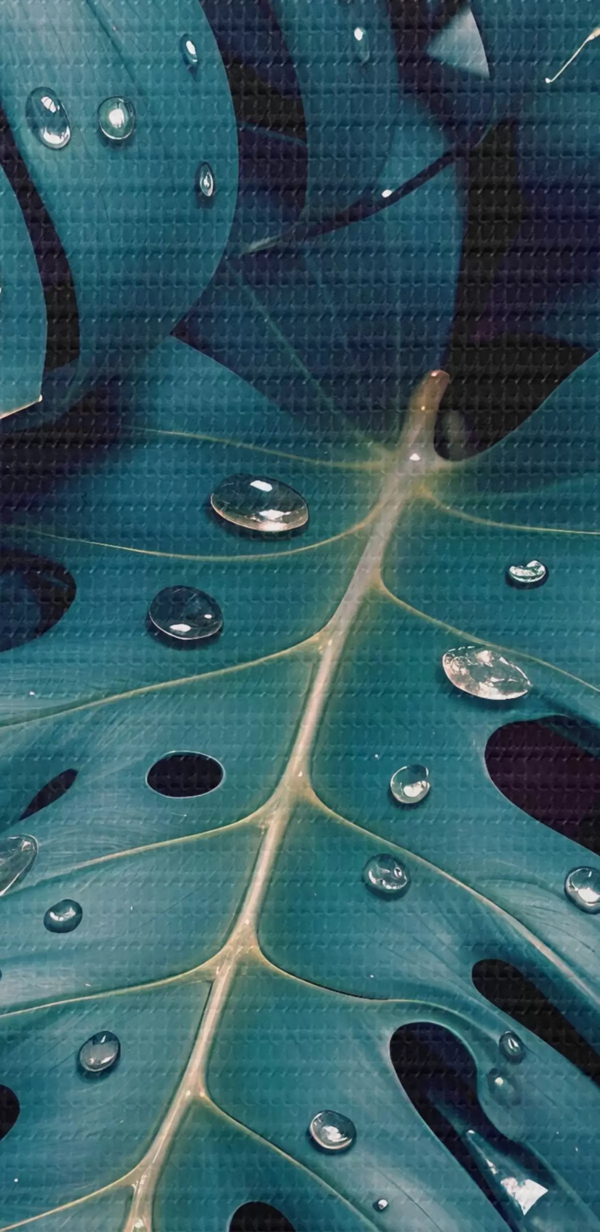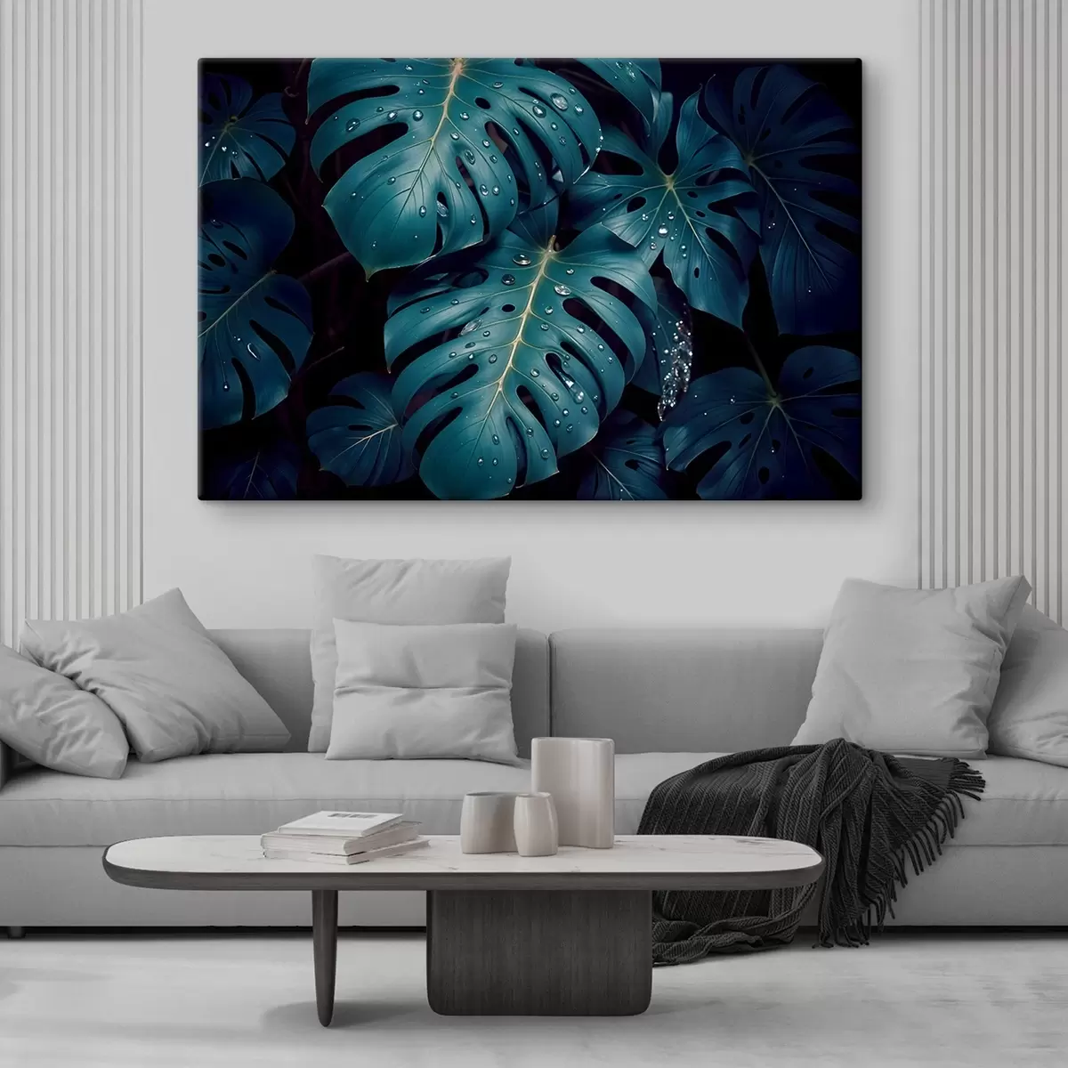 Schilderij Weelderige tropische monsterabladeren met waterdruppels tegen een donkere achtergrond, waardoor een stemmige en sfeervolle print ontstaat Art. s42233