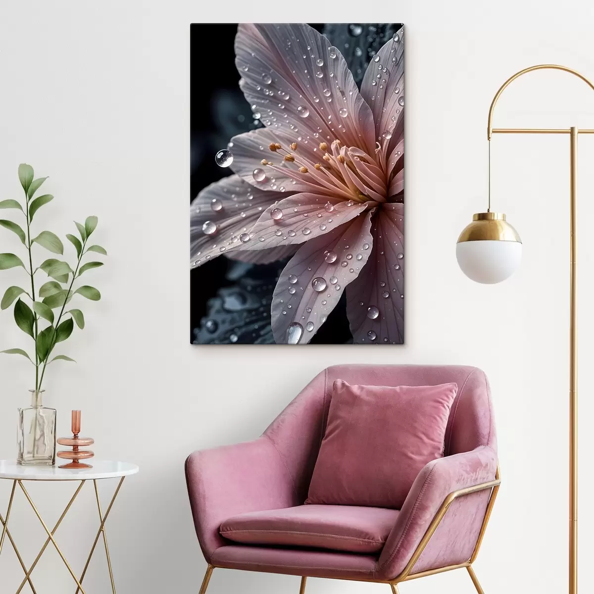 Schilderij Een close-up van een roze bloem met tere bloemblaadjes bedekt met waterdruppels, tegen een donkere achtergrond Art. s42237