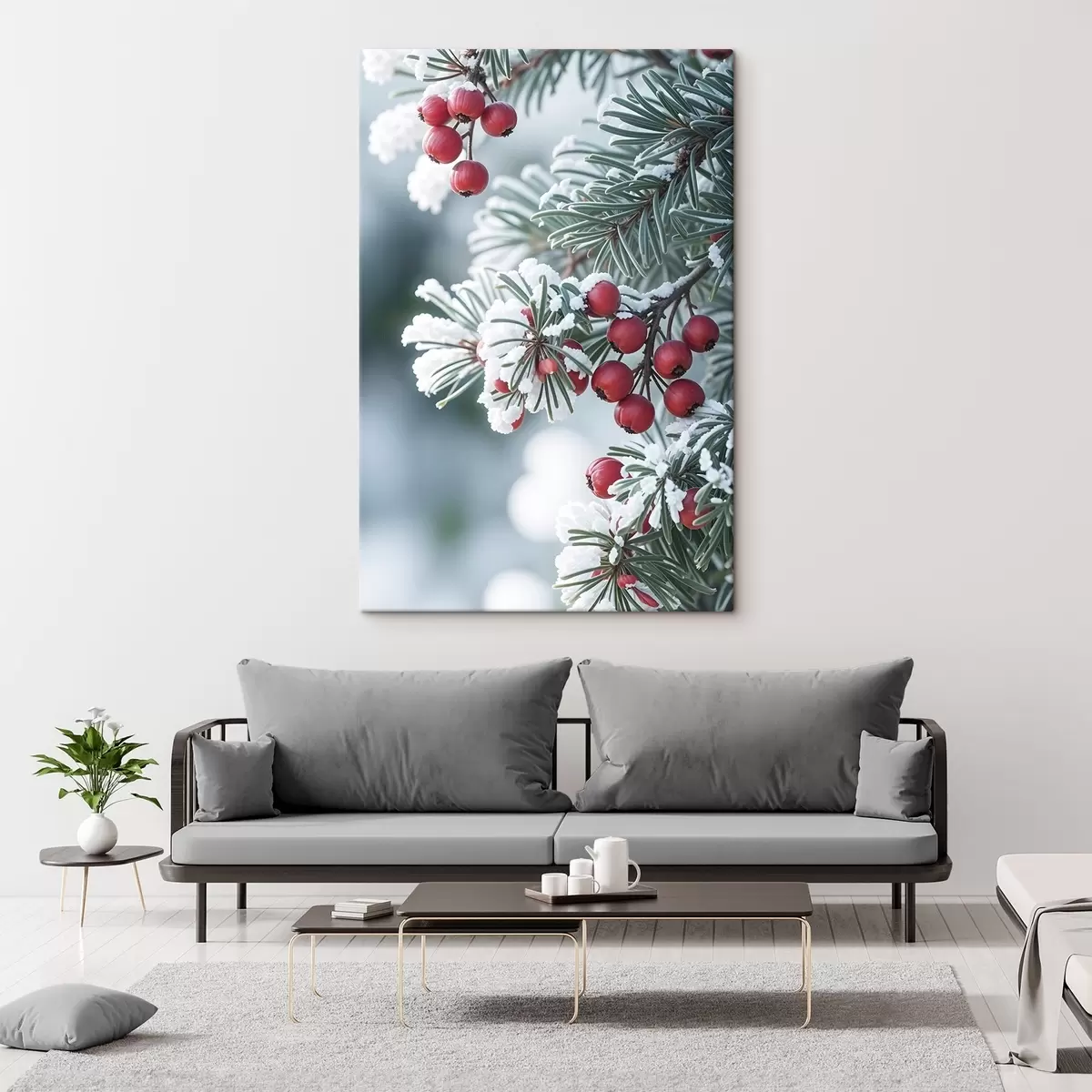 Schilderij Besneeuwde dennentak met rode bessen , winterscène Art. s42238