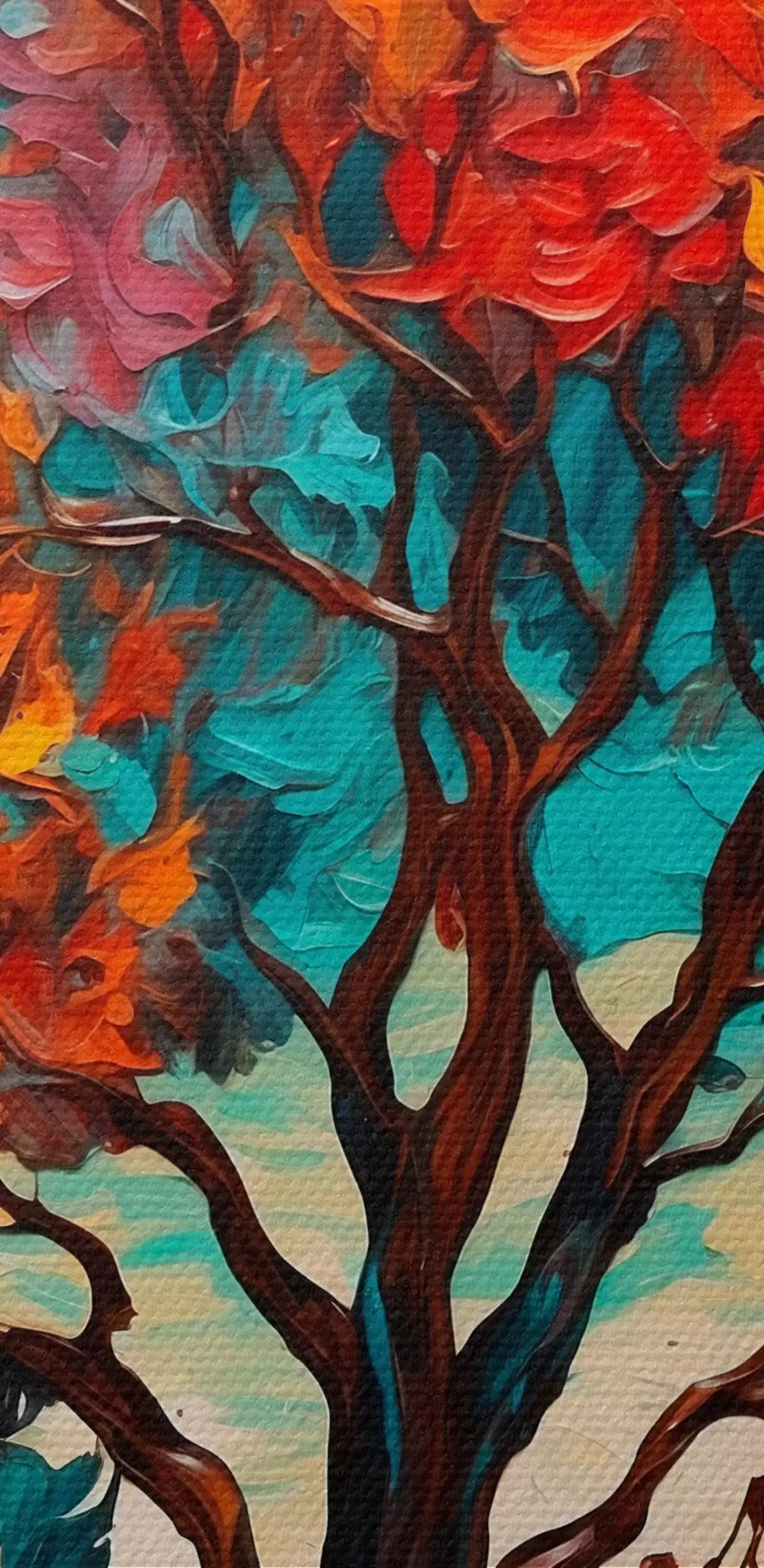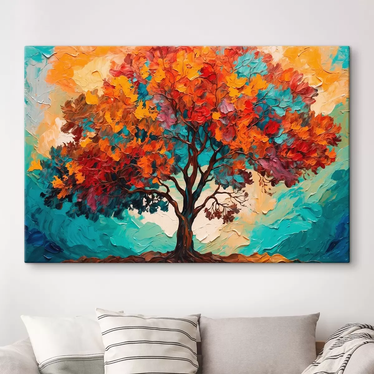 Schilderij Boom op oranje-blauwe achtergrond in olieverfstijl Art. s42267