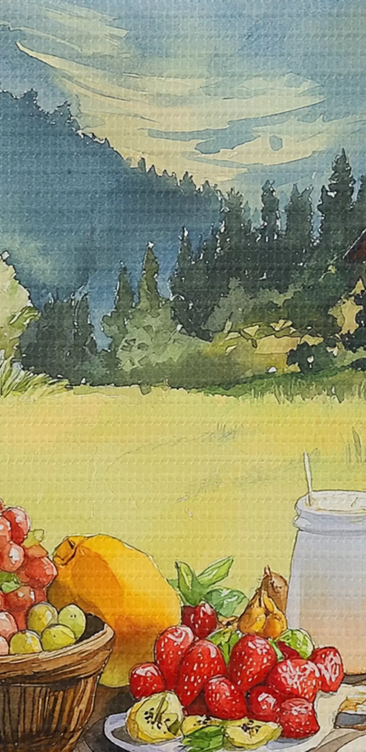 Schilderijen Berglandschappen, zomerweide, houten huizen, ontbijt s42425