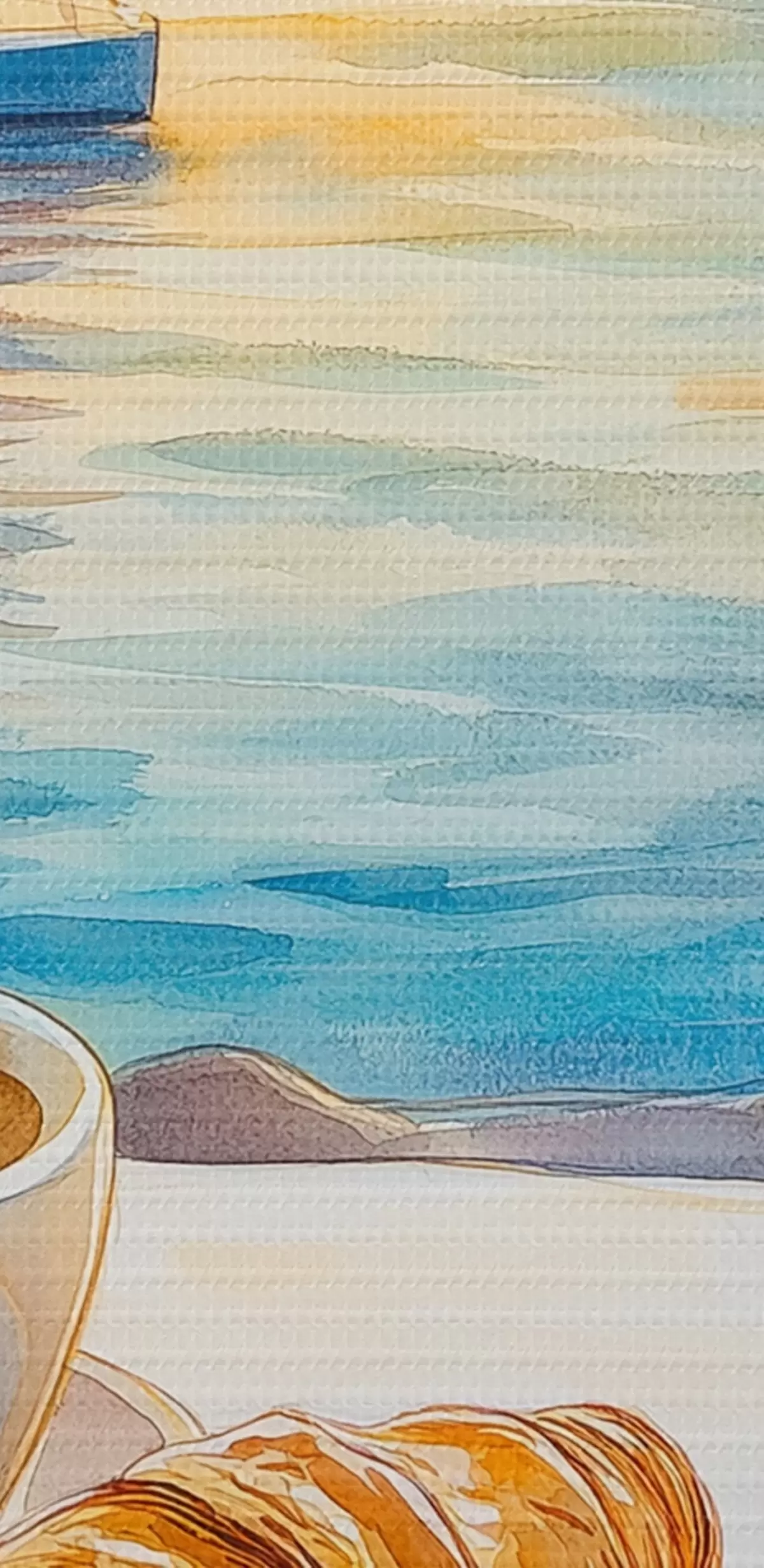 Schilderijen Twee kopjes cappuccino, aquarel stijl, zee zonsondergang, zeilboten, roeping s42438