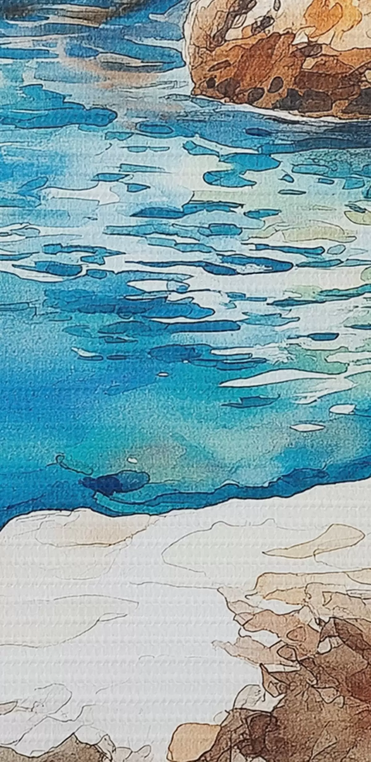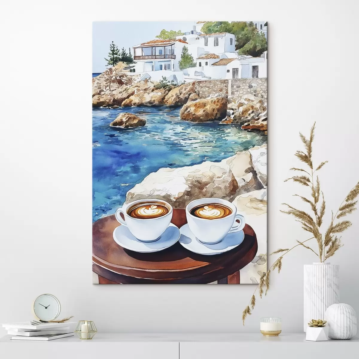 Schilderij Aquarel zeezijde met kopjes koffie, zomer Art. s42449