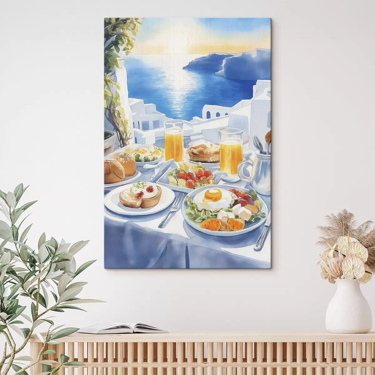 Schilderij Santorini landschappen, ontbijt, aquarel stijl, oude stad Art. s42454