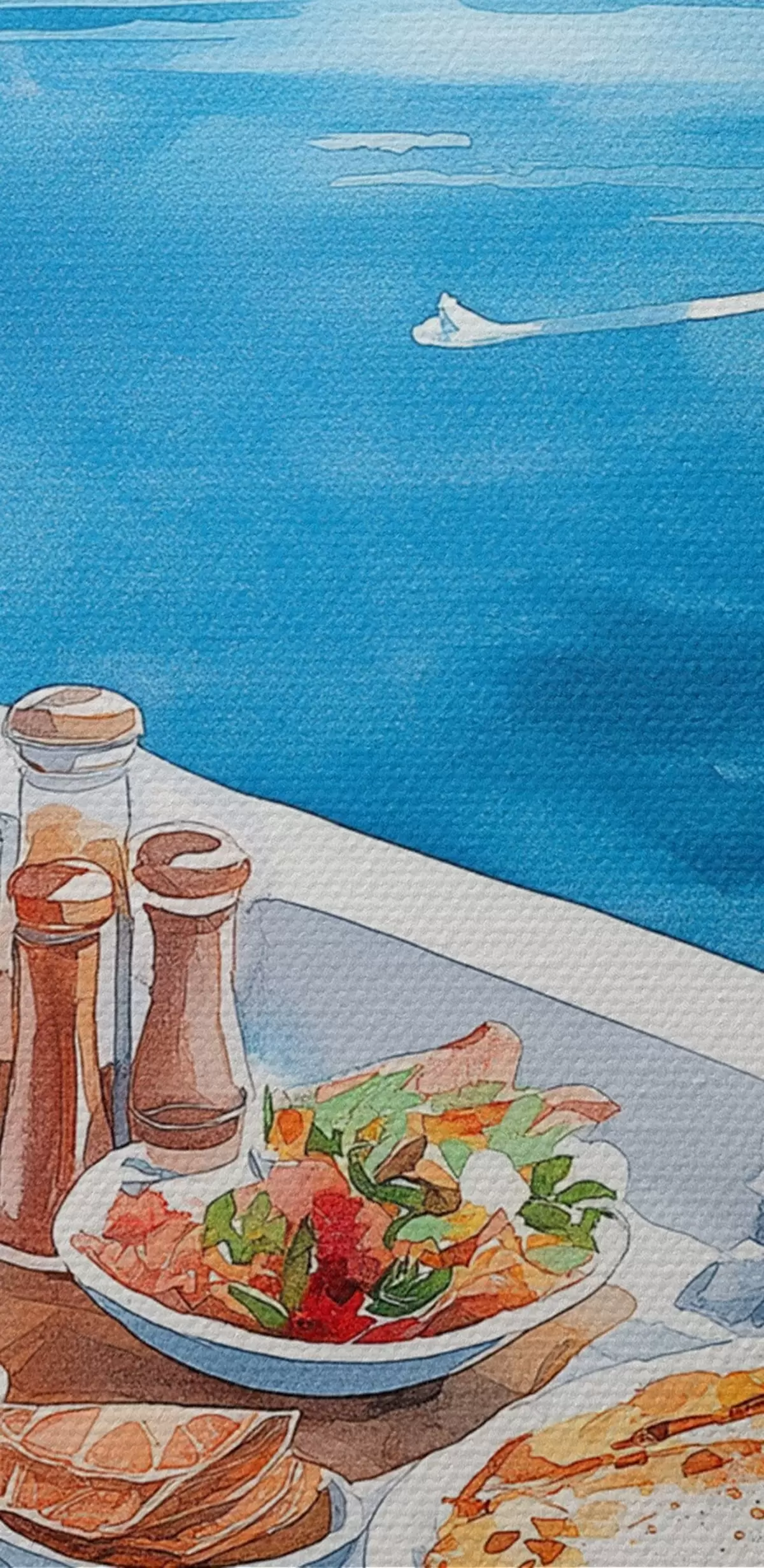 Schilderijen Mooi romantisch ontbijt in Griekenland, zee, aquarel stijl s42455