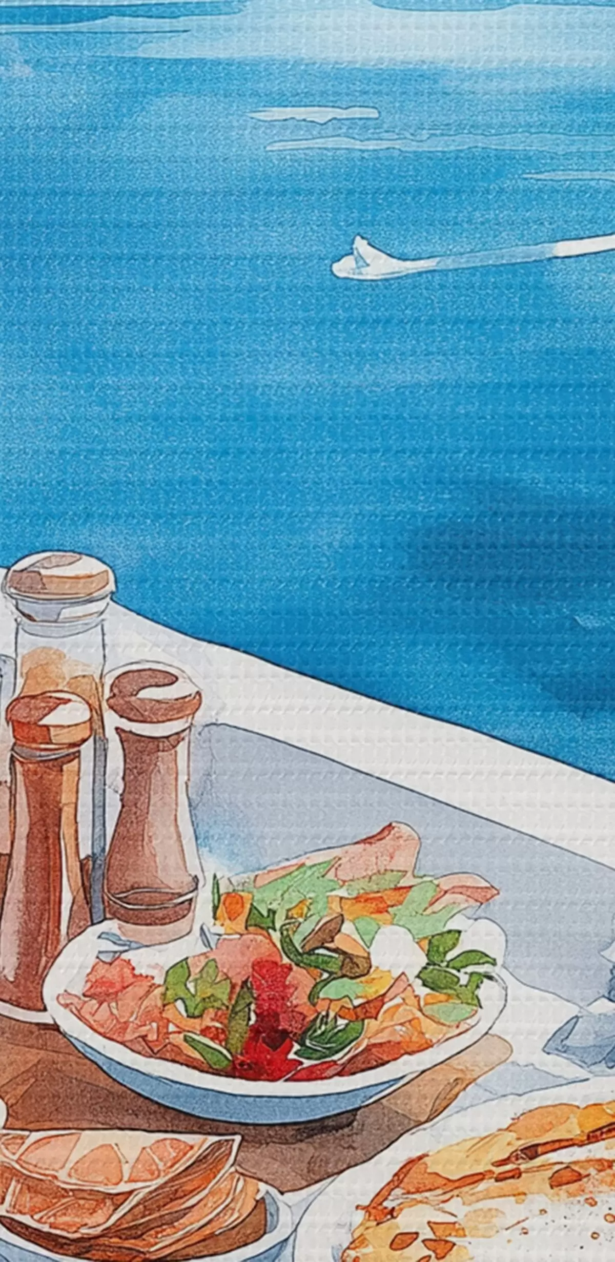Schilderij Mooi romantisch ontbijt in Griekenland, zee, aquarel stijl Art. s42455