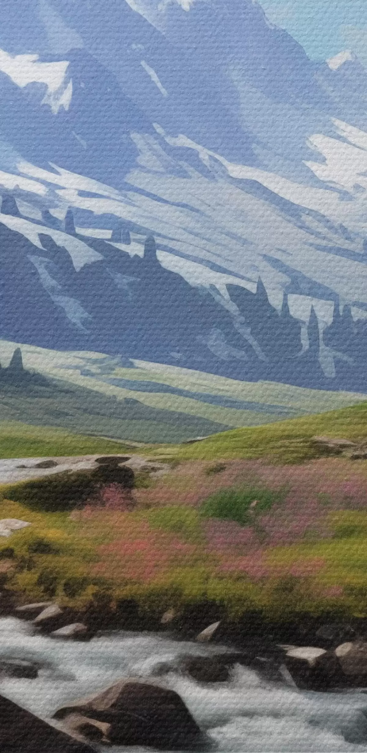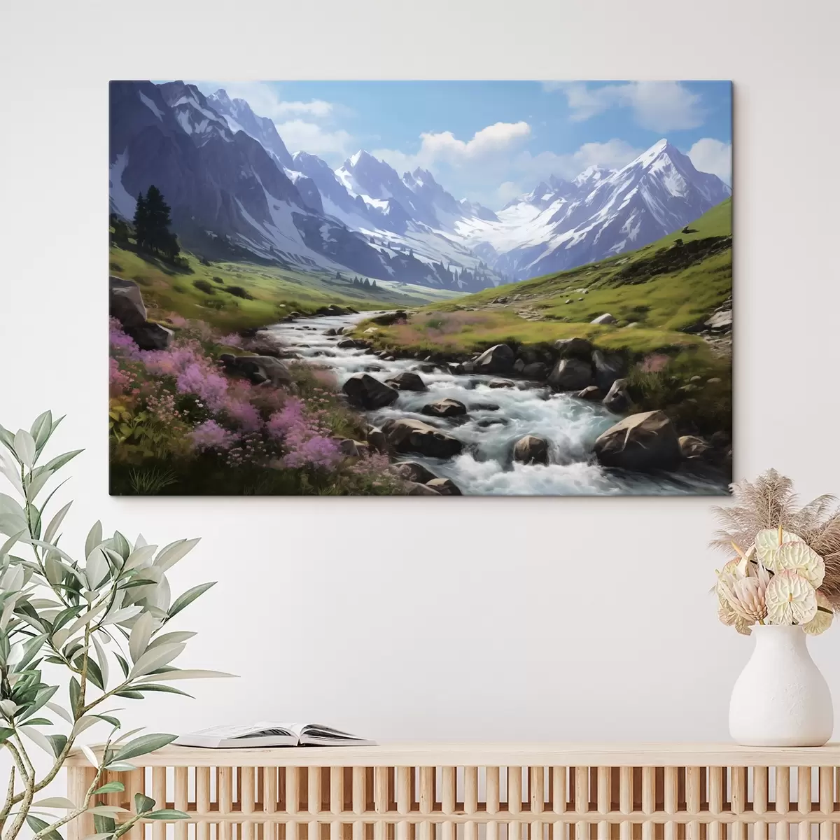 Schilderij Een berglandschap met een kabbelend beekje, bloeiende weiden en besneeuwde toppen aan de horizon onder een helderblauwe hemel. Art. s42563