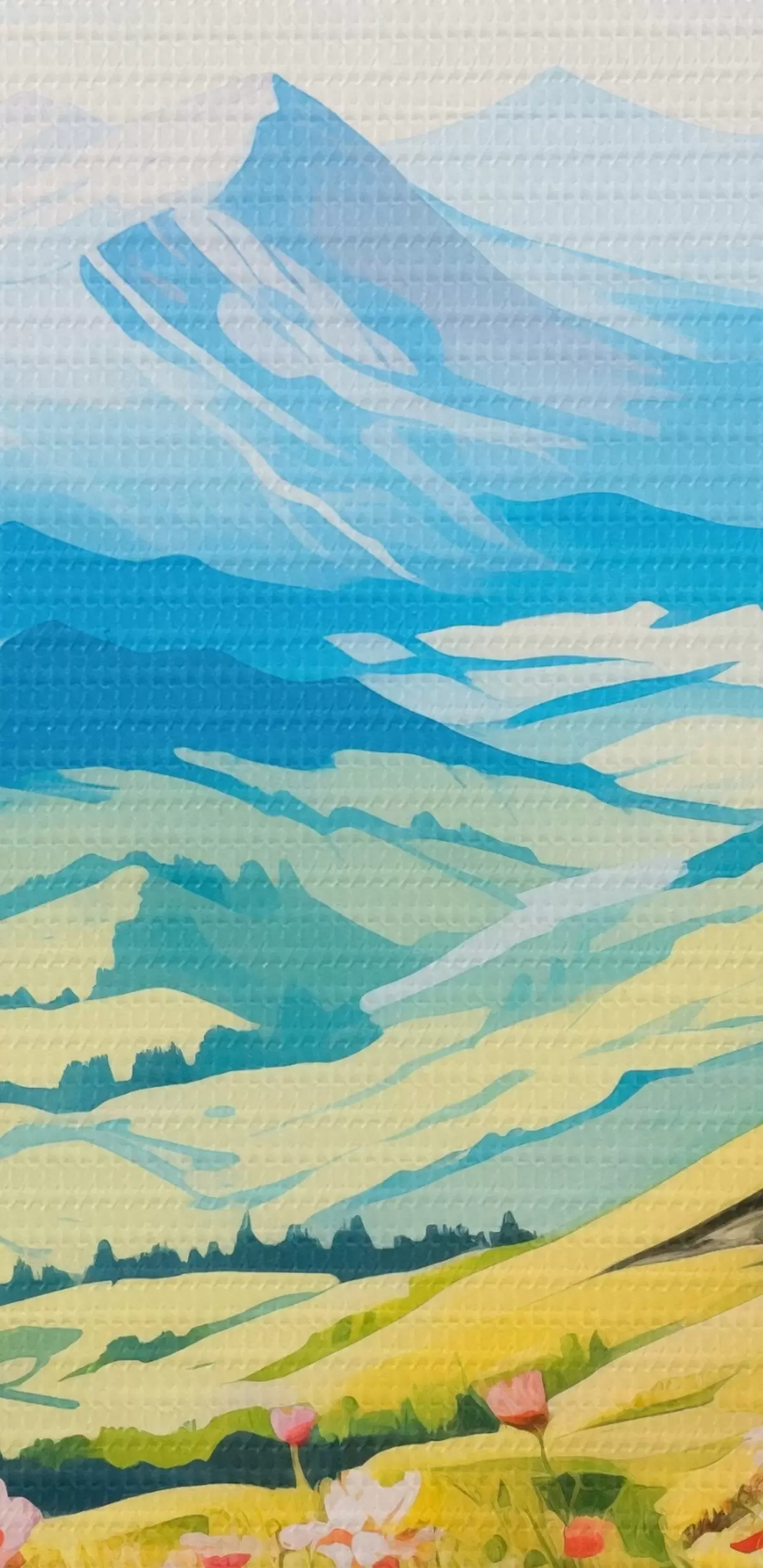 Schilderij Een levendig berglandschap met bloeiende weiden, groene heuvels en majestueuze bergtoppen onder een helderblauwe hemel. Art. s42565