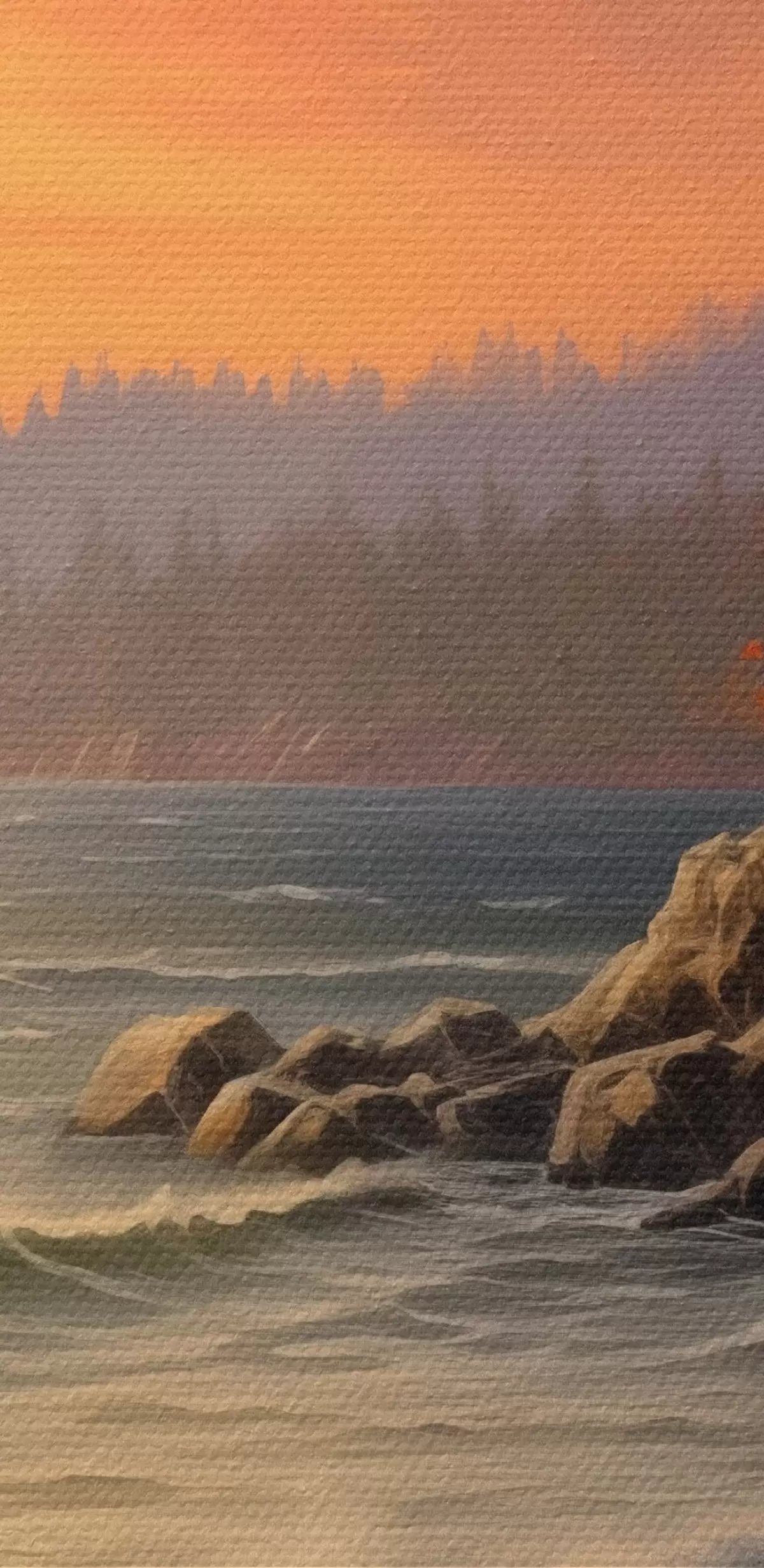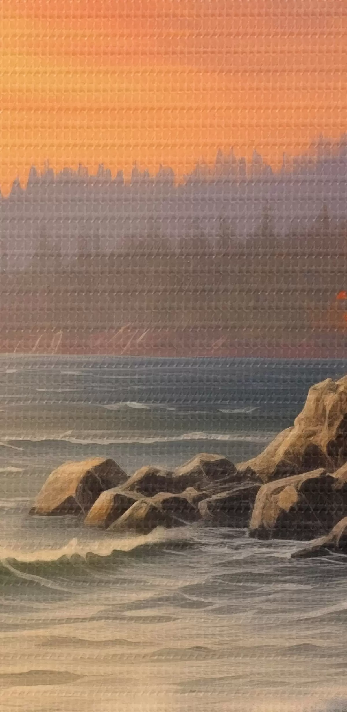 Schilderij Een zonsondergang aan zee met golven, een dennenbos en herfstkleuren op de voorgrond. Art. s42571