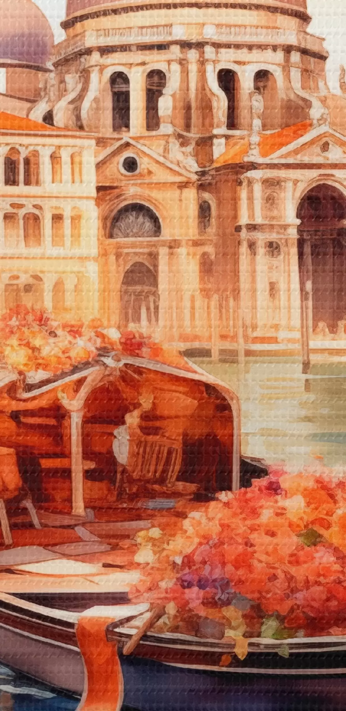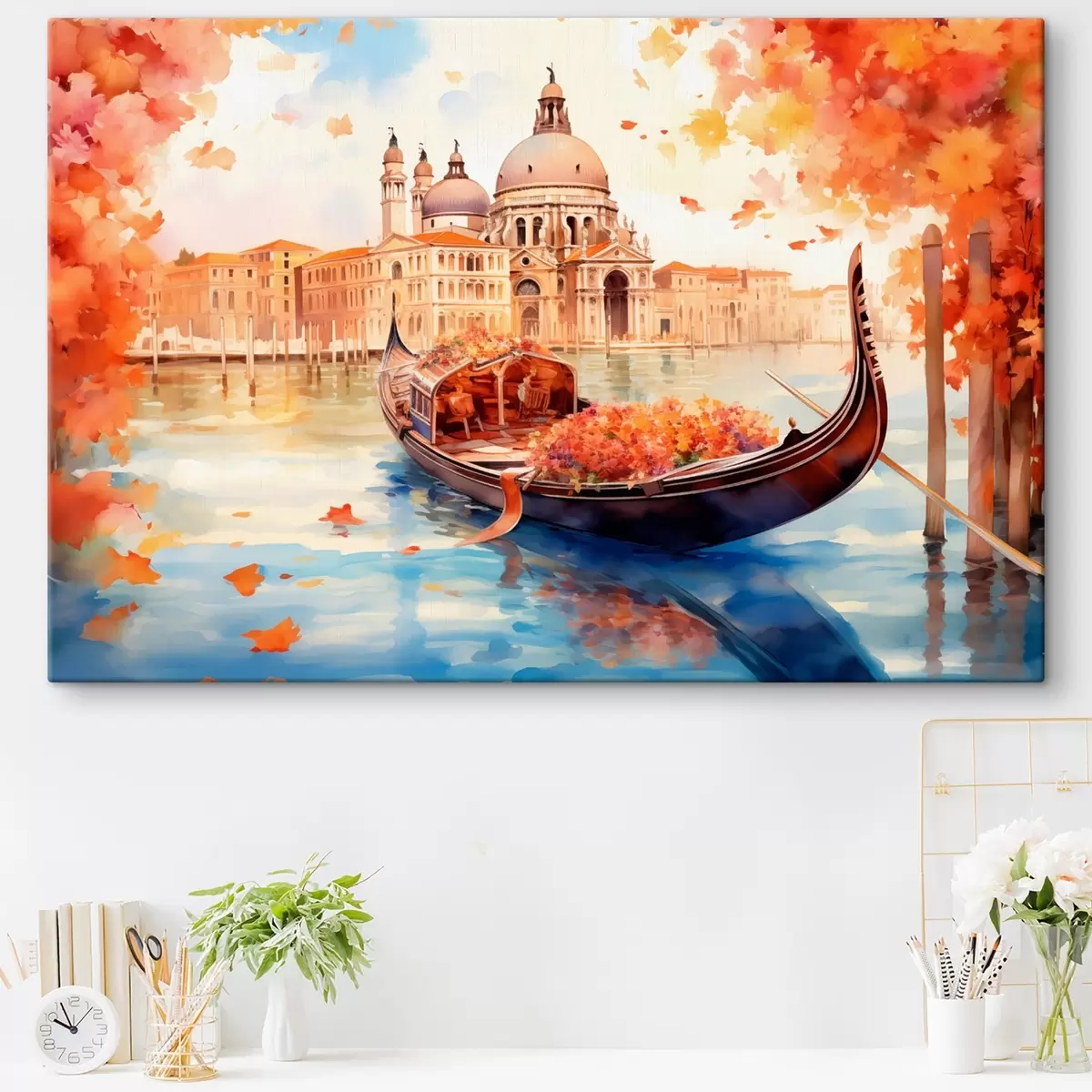 Schilderij Een herfstgezicht op Venetië met een gondel omringd door fel oranje en rode bladeren, met weerspiegelingen van gebouwen in het kalme kanaalwater. Art. s42576