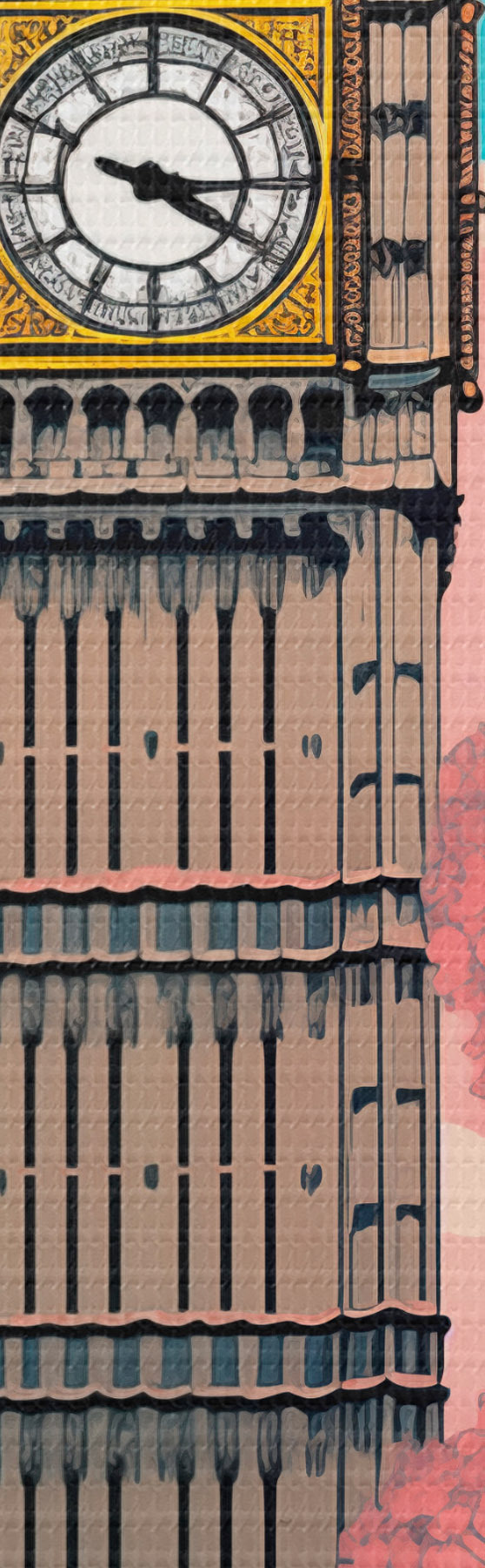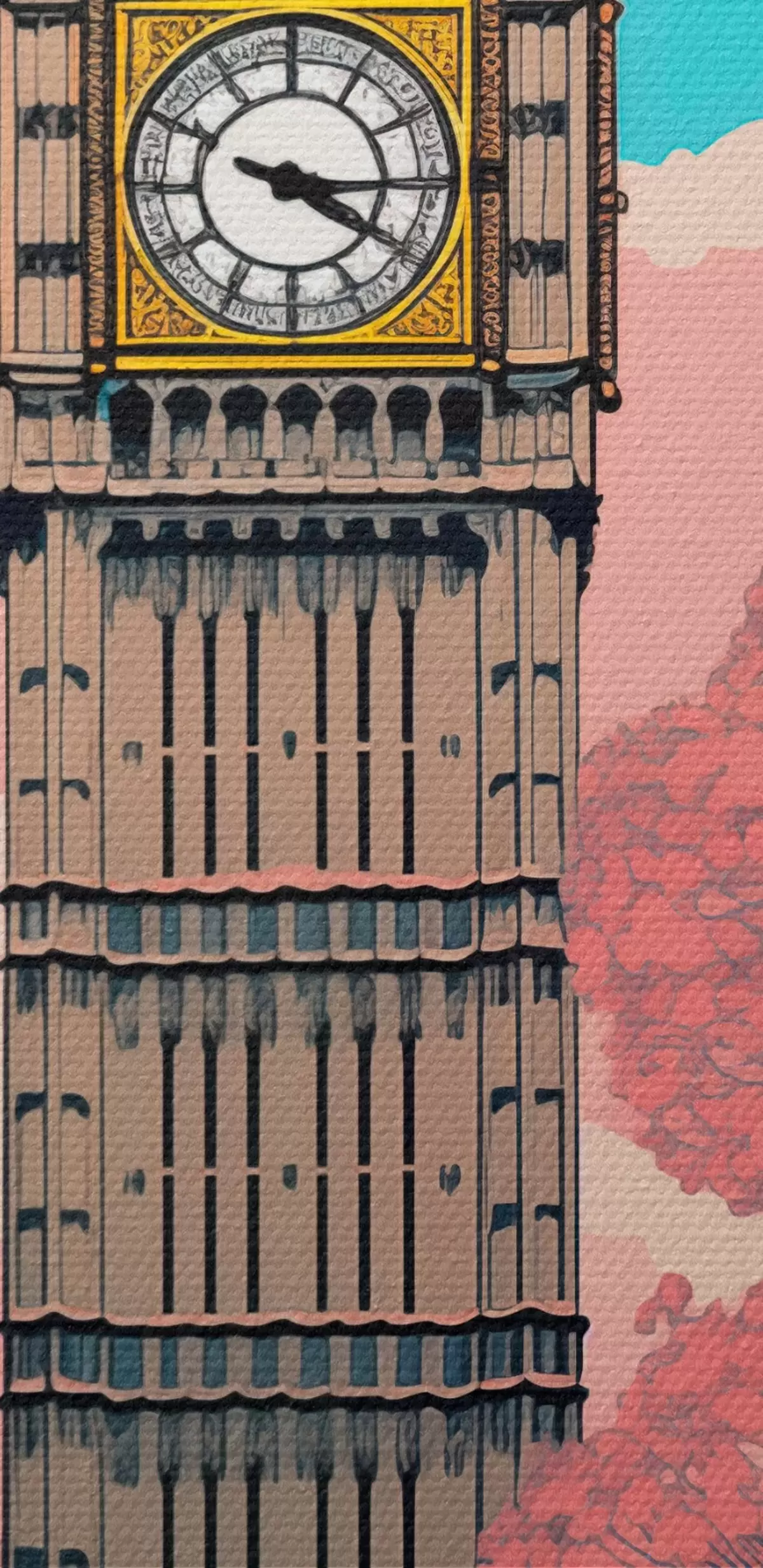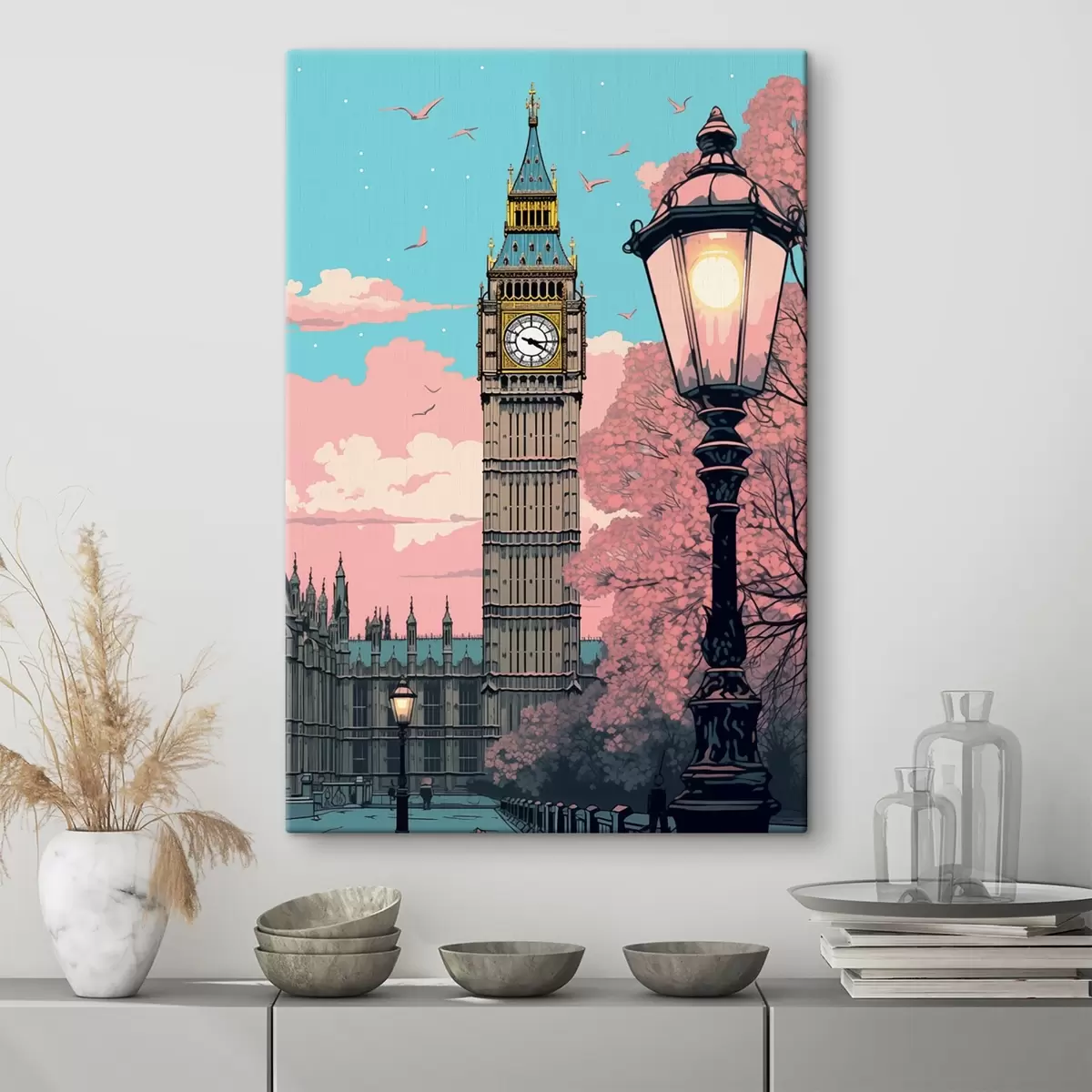 Schilderij Een blik op de Big Ben met lenteroze bomen, een helderblauwe lucht en een vintage straatlantaarn op de voorgrond. Art. s42578