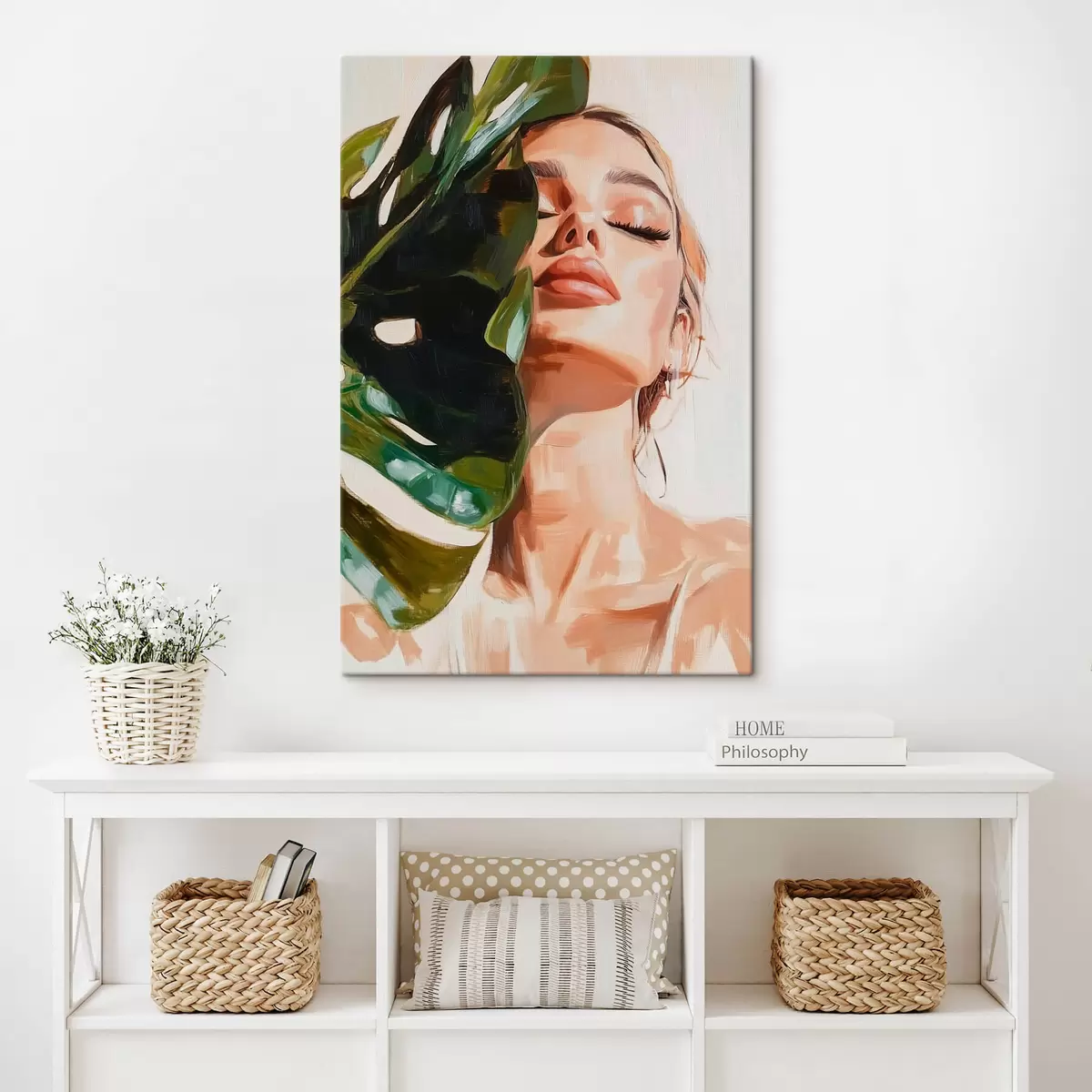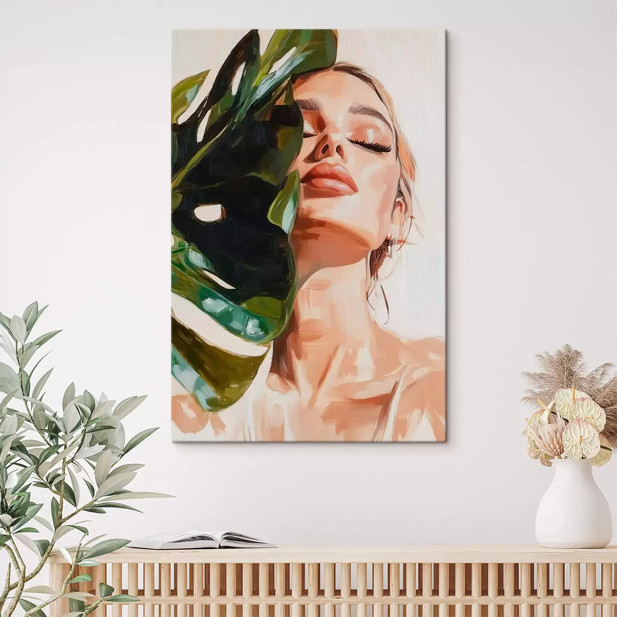 Schilderij Portret van een vrouw met een monsterablad met imitatie penseelstreken Art. s42597