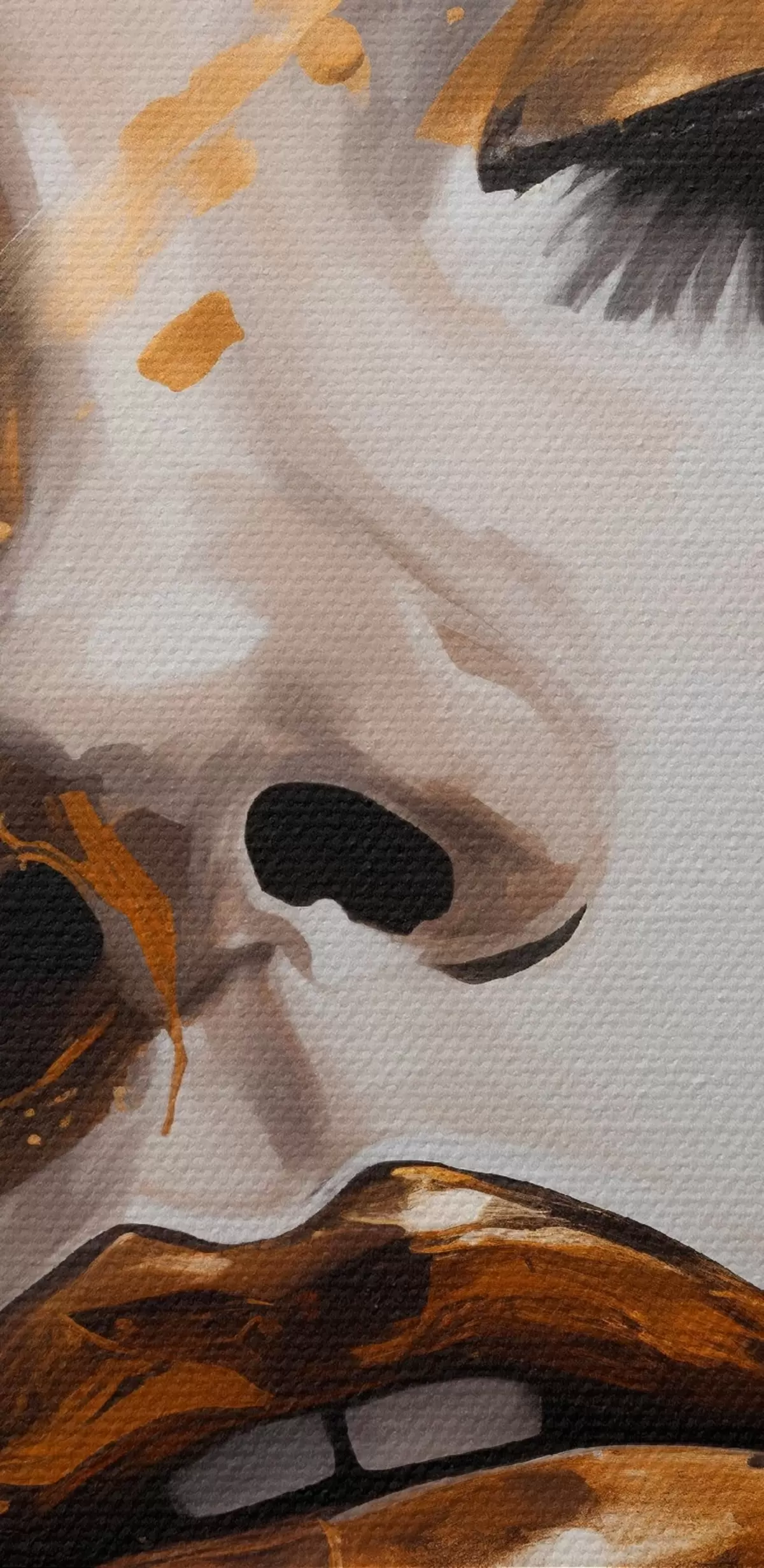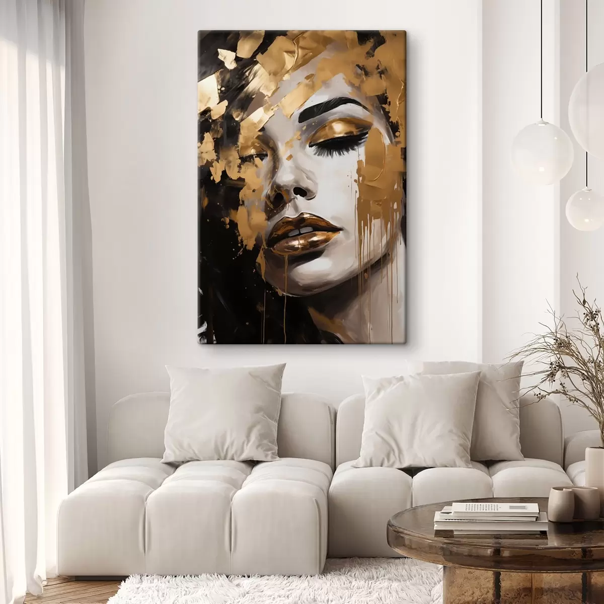 Schilderij Een abstract portret van een vrouw met rijke penseelstreken in warme tinten, waardoor een levendig en dramatisch beeld ontstaat. Art. s42619
