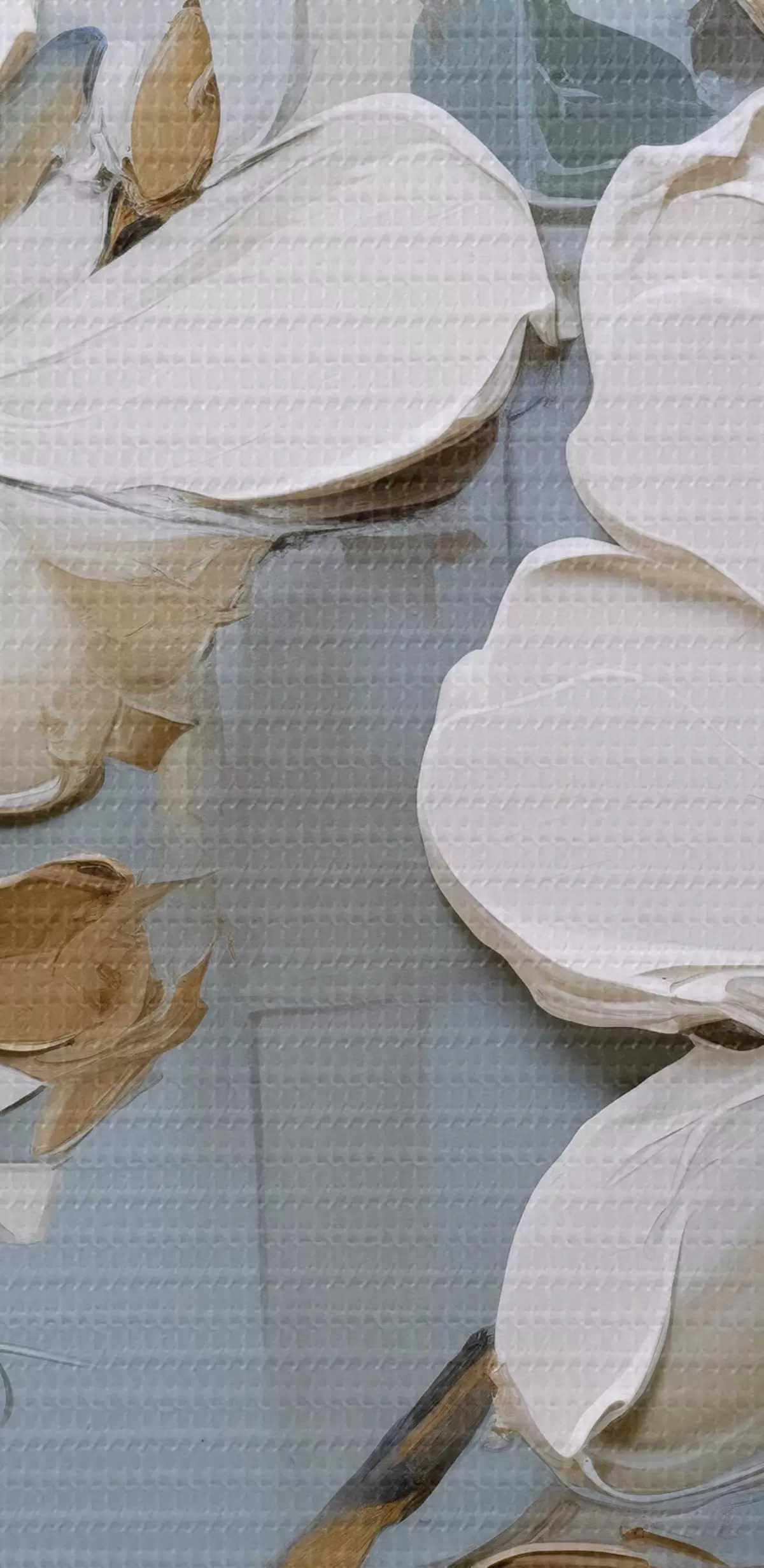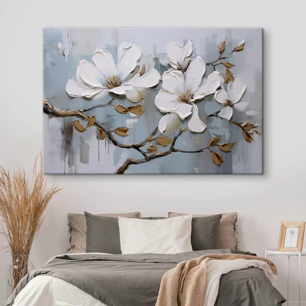 Schilderij Witte magnolia bloemen met getextureerde bloemblaadjes en bruine bladeren op een zachtblauwe achtergrond olieverfschilderij imitatie Art. s42711