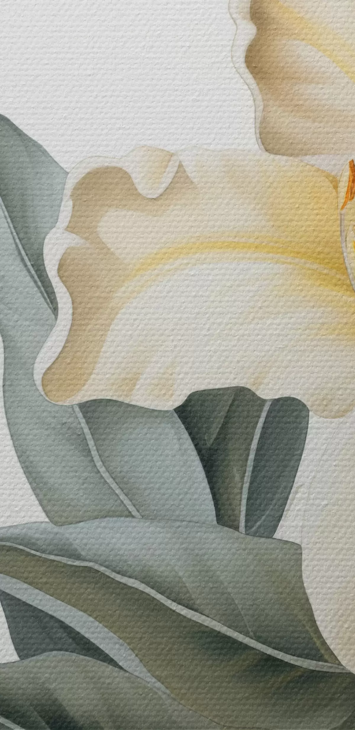 Schilderij Botanische illustratie van witte en lichtgele bloemen met ingewikkelde bloemblaadjes, omringd door groene bladeren Art. s42712
