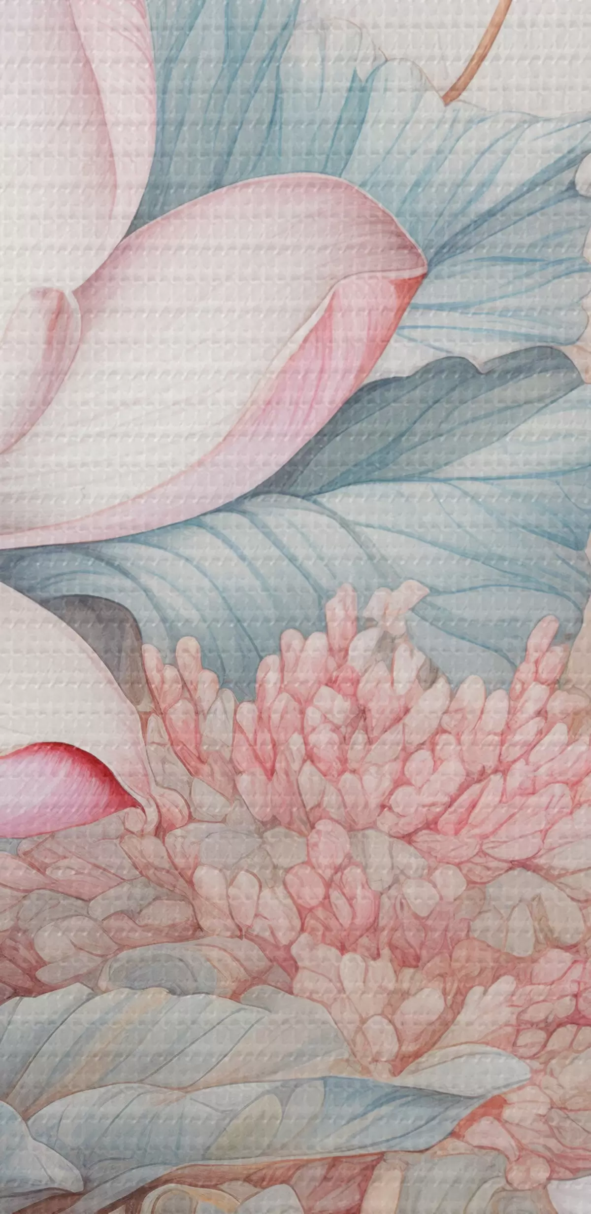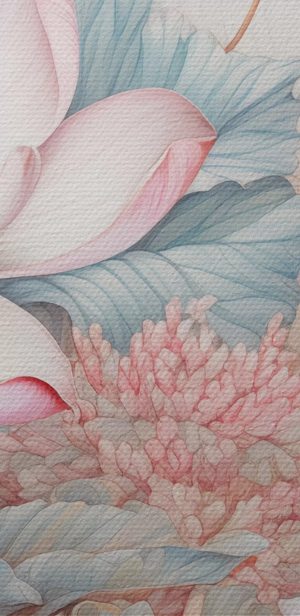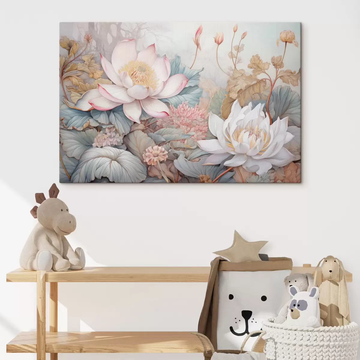 Schilderij Grote, bloeiende lotusbloemen in zachtroze en witte tinten, omringd door groene bladeren en delicaat roze gebladerte Art. s42729