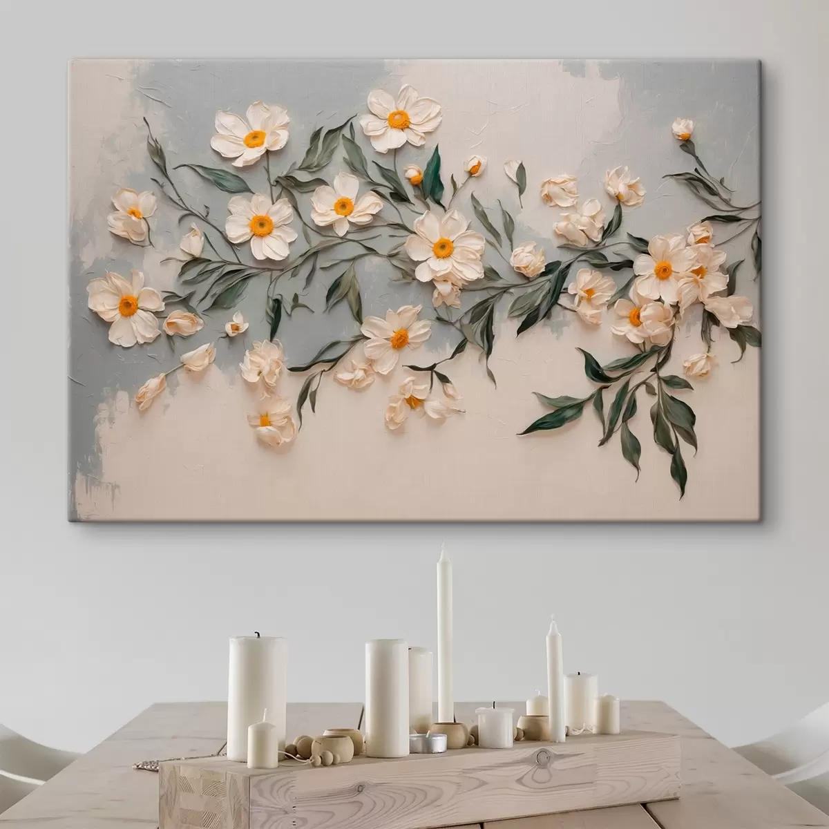 Schilderijen Witte bloemen en bladeren op witte en grijze achtergrond s42764