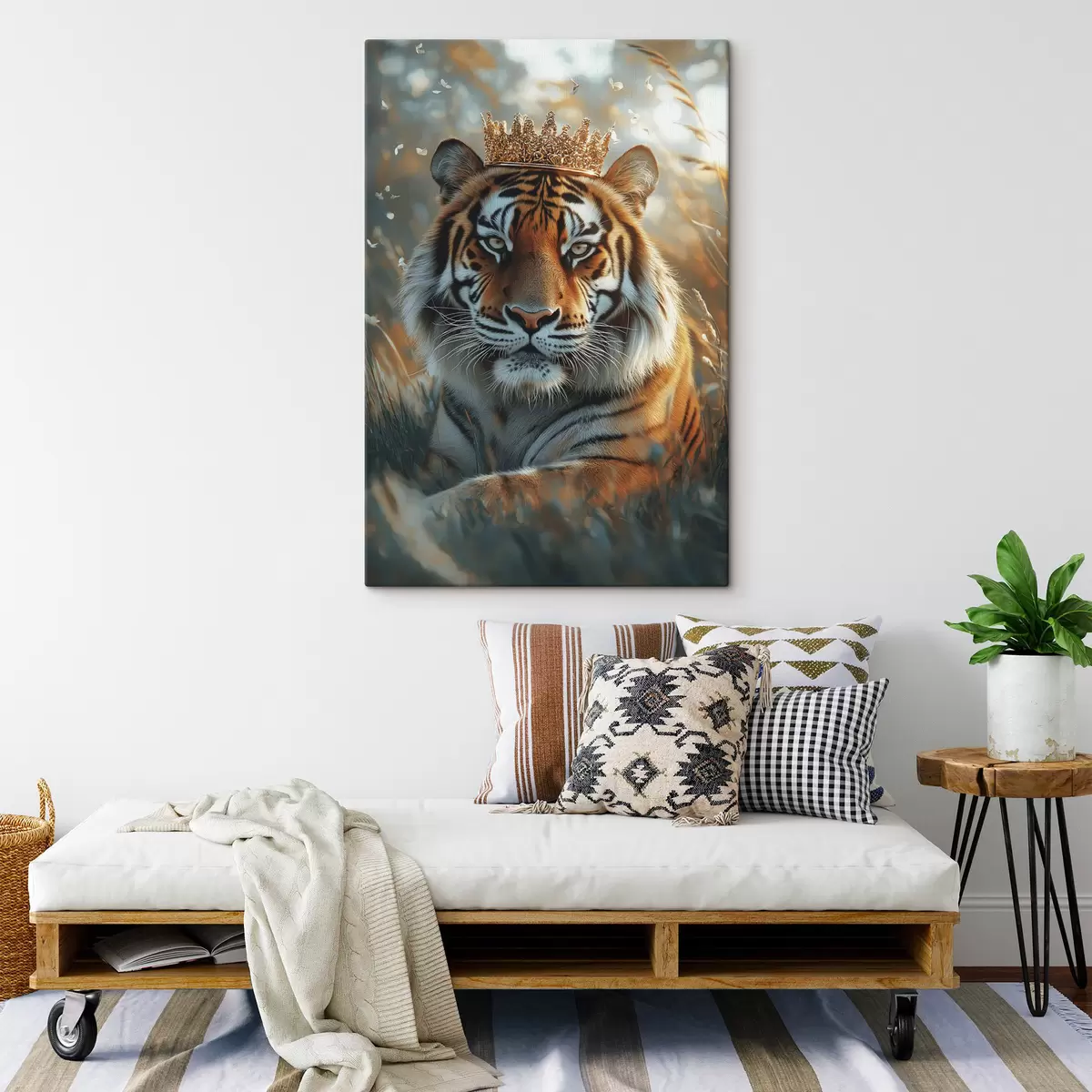 Schilderijen Mooie tijger met kroon, zomerse weide, realisme s42786
