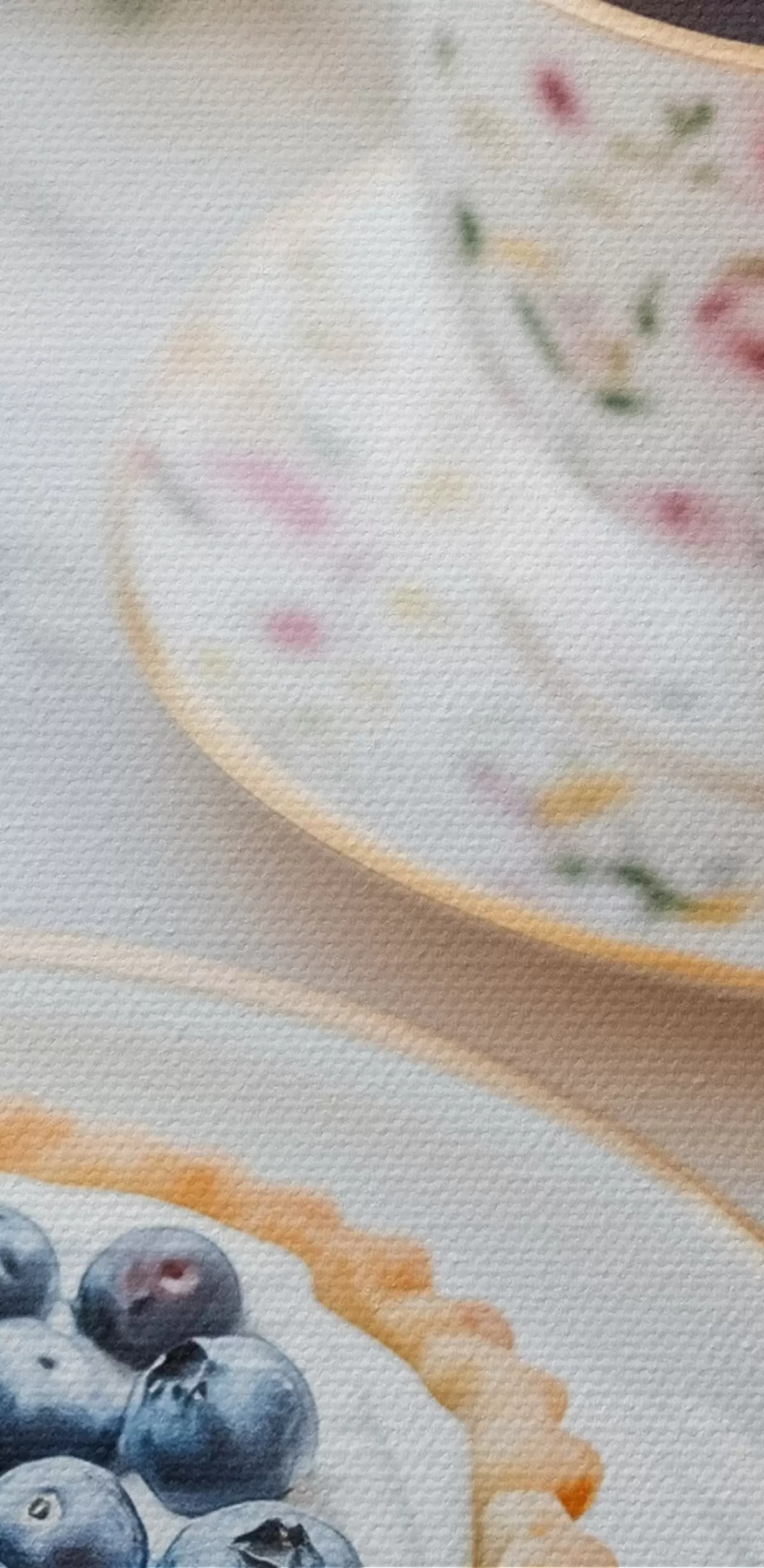 Schilderij Bosbessen cupcake met kopje thee, boho stijl, roze rozen Art. s43066