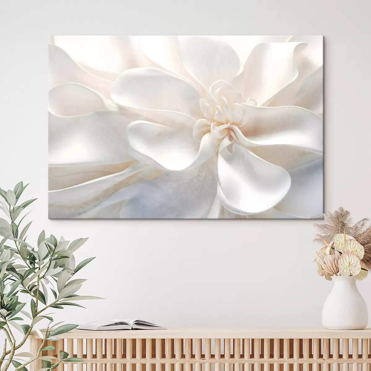 Schilderij Close-up van een heldere witte abstracte bloem met fijne bloemblaadjes in pastelkleuren Art. s43161