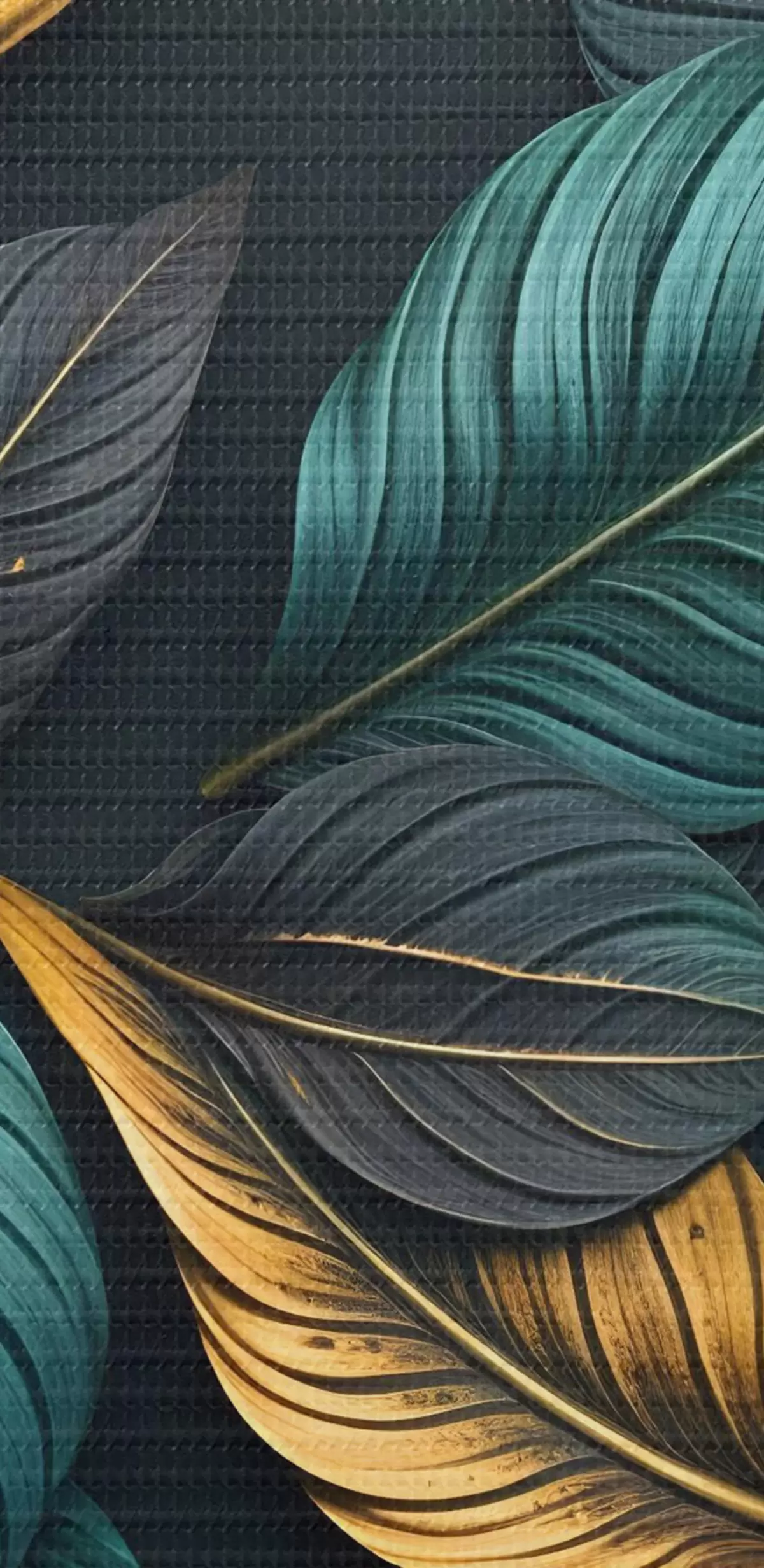 Schilderij Donkergroen, geel en zwart blad met donkere nerven, op een donkere achtergrond, elegante tropische vibe Art. s43164