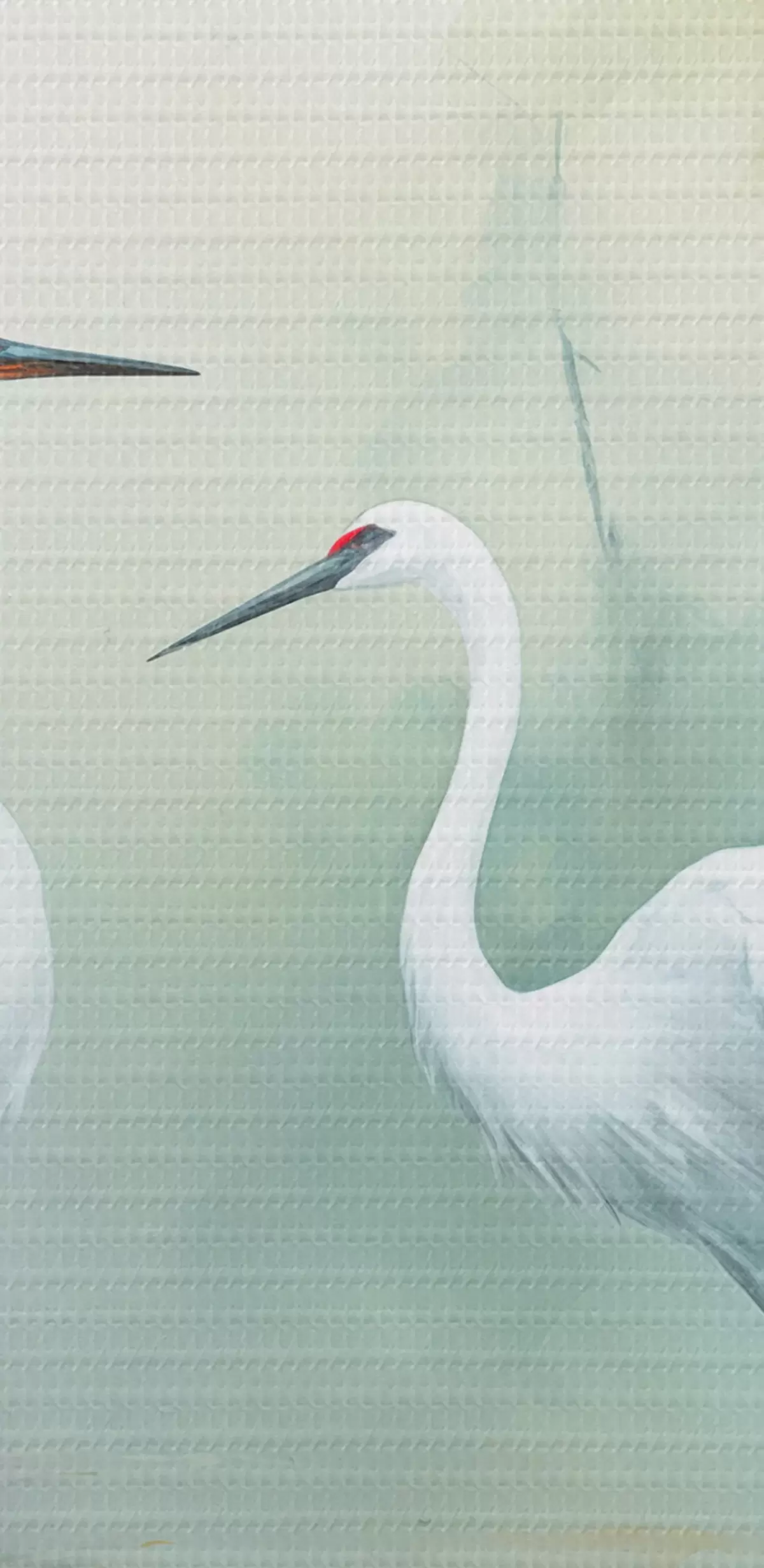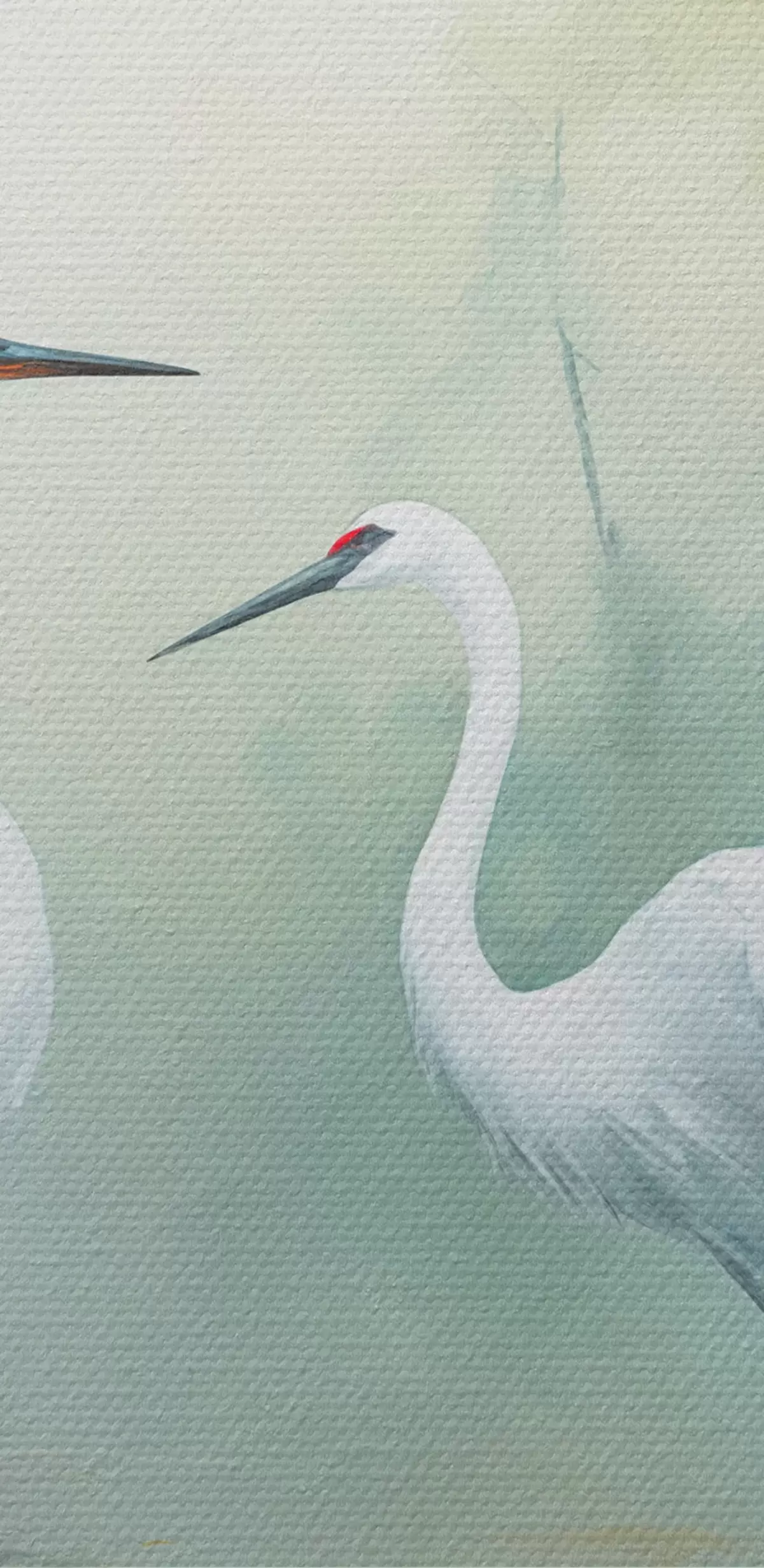 Schilderij Twee witte kraanvogels in een vijver, omringd door een weelderig groen bos met zachte, diffuse verlichting Art. s43166
