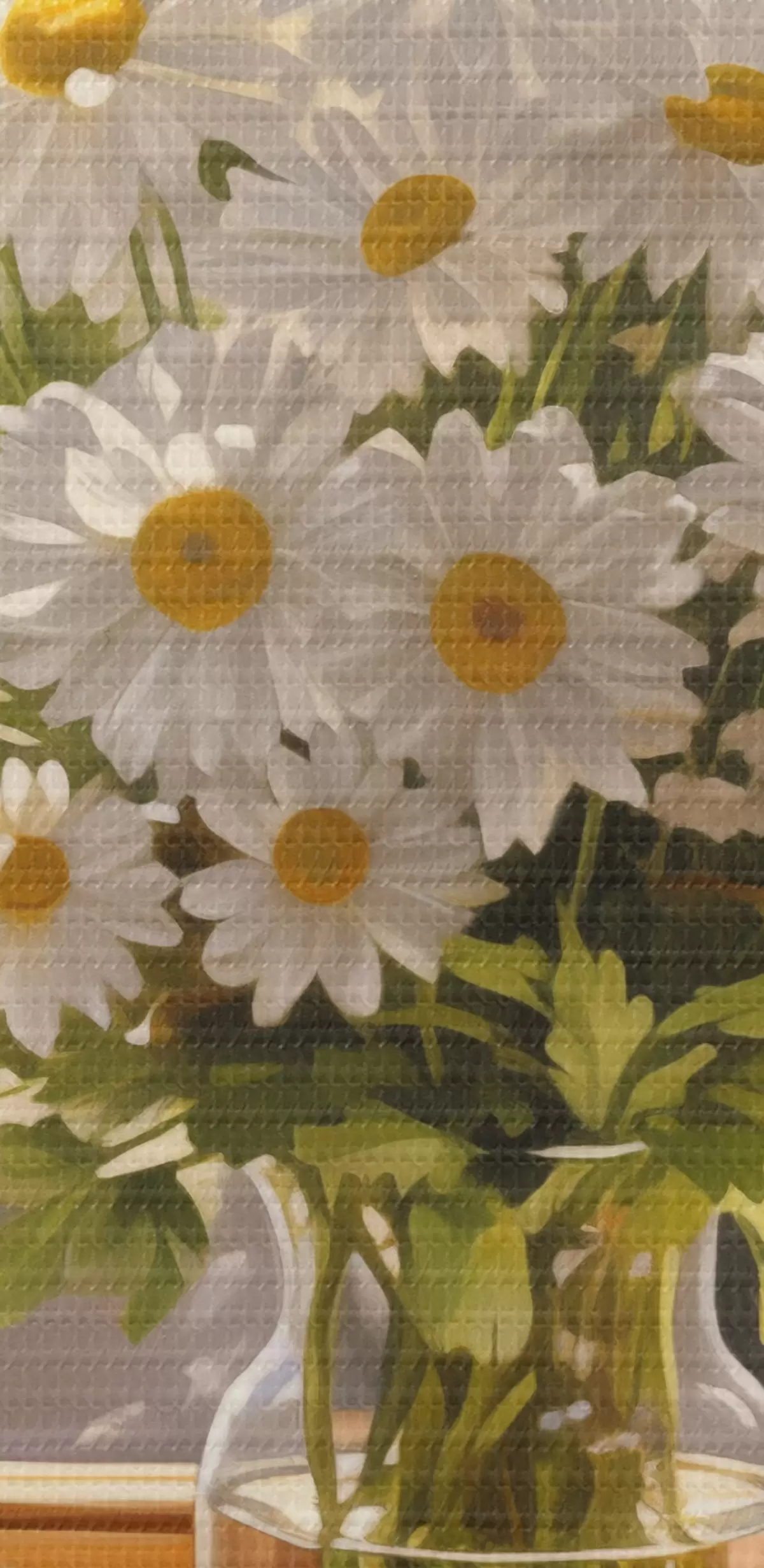 Schilderij Olieverfschilderij imitatie van een vaas met witte madeliefjes op een vensterbank, zonnige dag, warm kleurenpalet Art. s43171