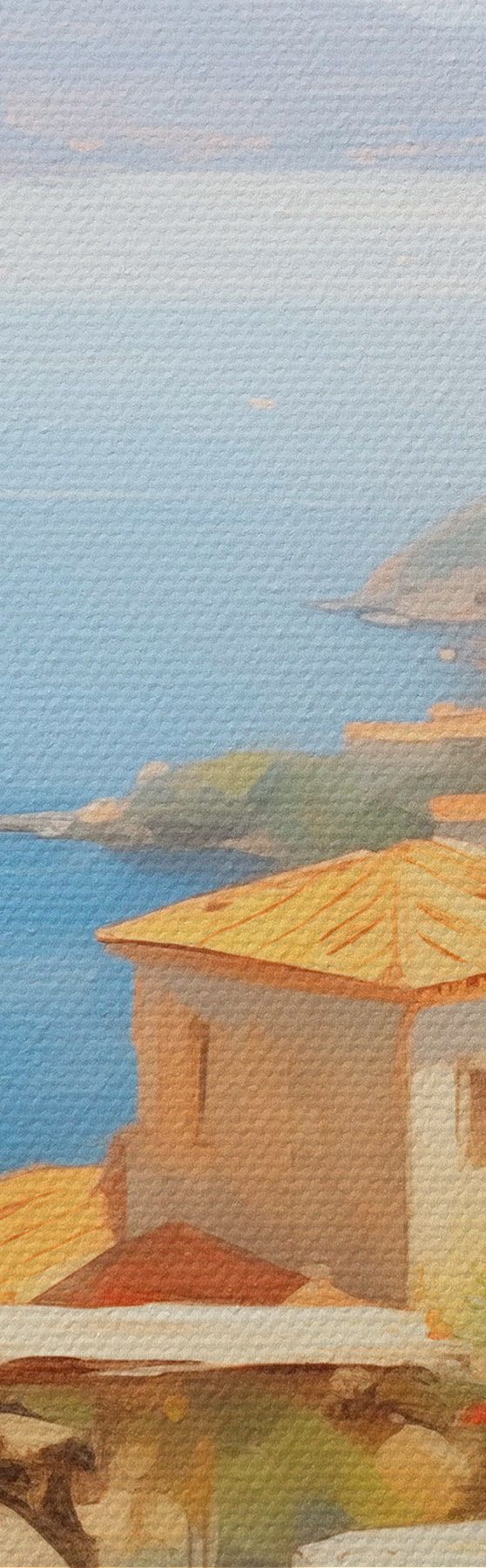Schilderij Olieverfschilderij imitatie van balkon met bloemen, met uitzicht op de zee, huizen aan de kust, zonnige dag, blauwe lucht Art. s43173