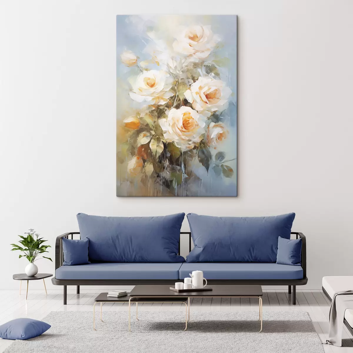 Schilderij Witte rozen met oranje, tegen een zachte, lichtblauwe achtergrond, met zichtbare penseelstreken en een schilderachtige stijl Art. s43175