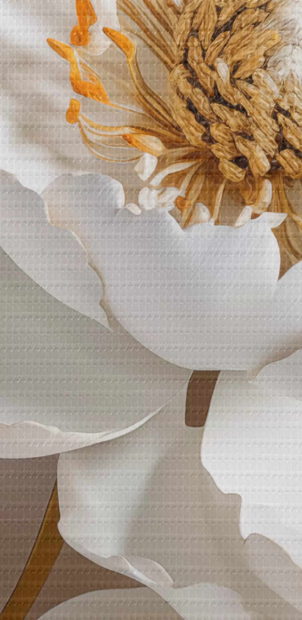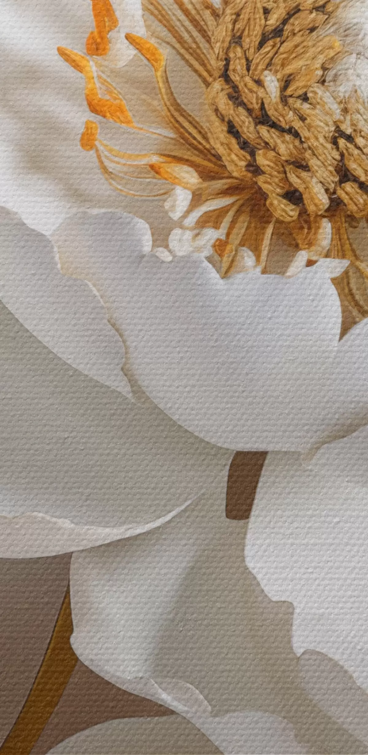 Schilderij Witte delicate gedetailleerde decoratieve pioenbloemen met gele bladeren, de achtergrond is een lichtgrijze kleur Art. s43176